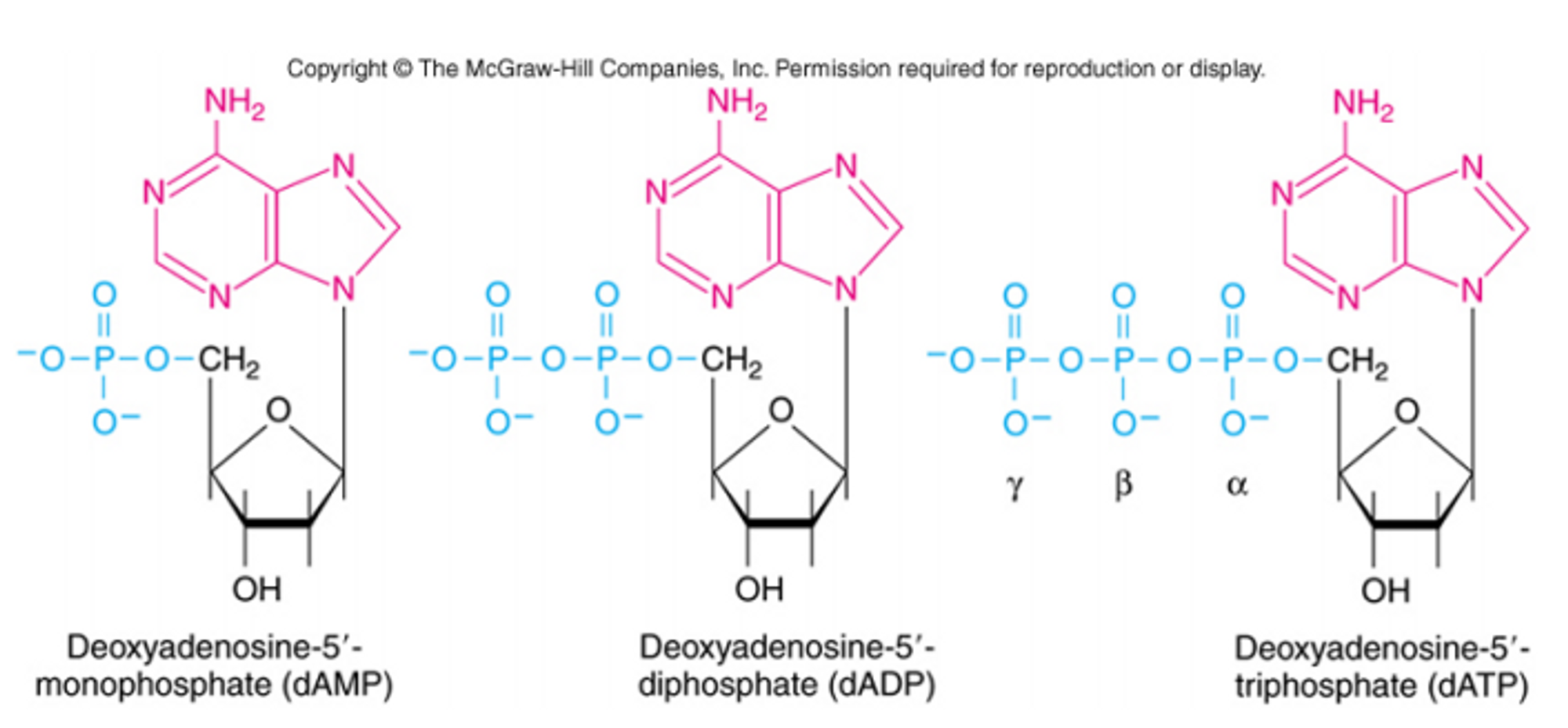 한편 위 그림과 같이 어떤 염기가 달려있는지, 당의 종류가 무엇인지, phosphate가 몇 개 달려있는지에 따라 명명이 달라지므로 이에 유의할 필요가 있음. (참고로 nucleoside에 붙는 인산기를 명명할 때는 당에 가까운 쪽(즉, 5' 탄소에 가까운 쪽)부터 alpha, beta, gamma 순으로 명명함)