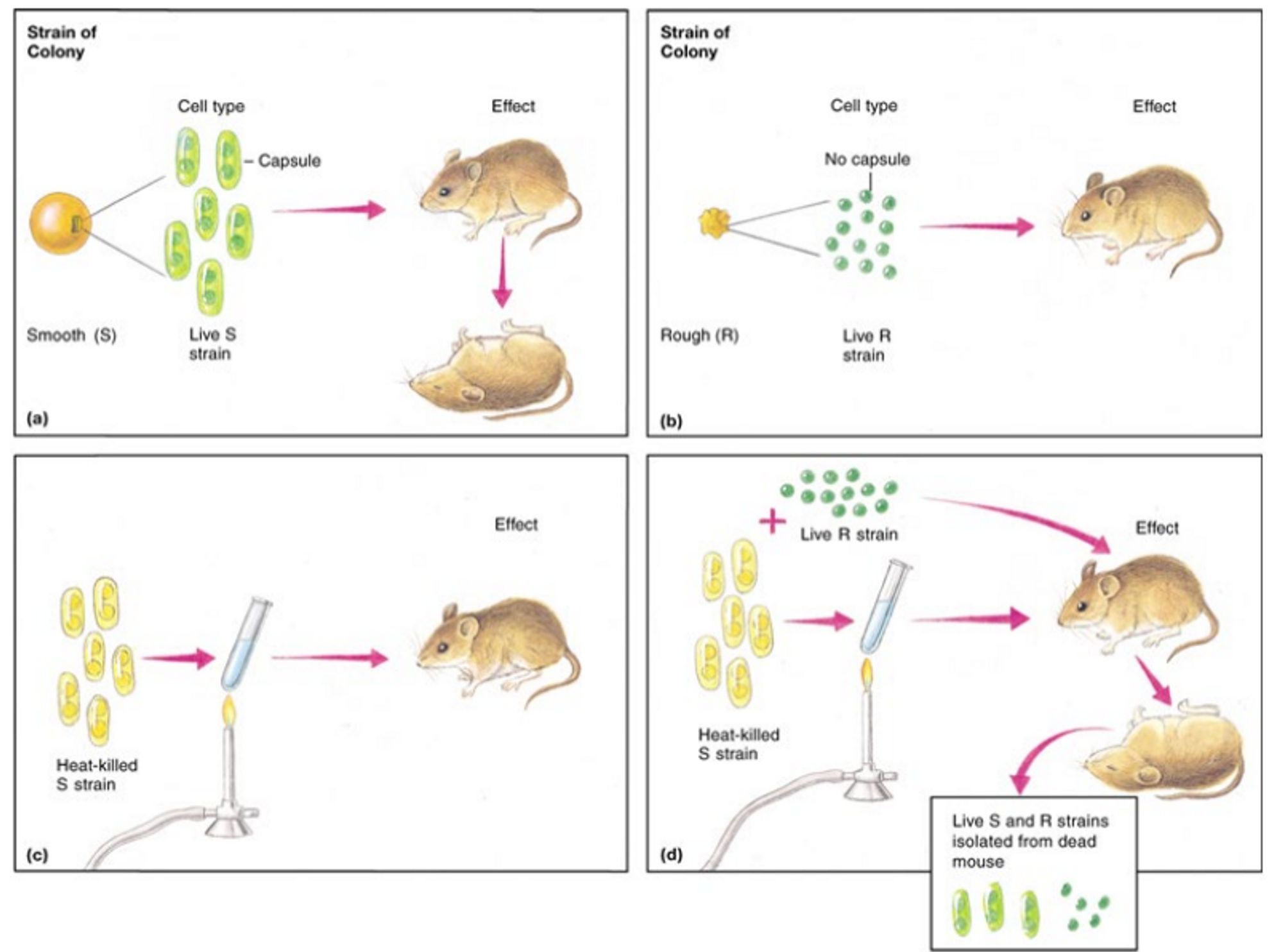 이 실험에는 Streptococcus pneumoniae가 사용되었으며 이 종에는 avirulent (R) rough colony(capsule을 가지고 있지 않은 세균)와 virulent (S) smooth colony(capsule을 가진 세균)의 두 종류가 있었음. 이 때 S colony의 경우 숙주에 감염시킬 시 매우 치명적이었지만 R colony의 경우 숙주에 감염되어도 큰 영향을 미치지 않았음.