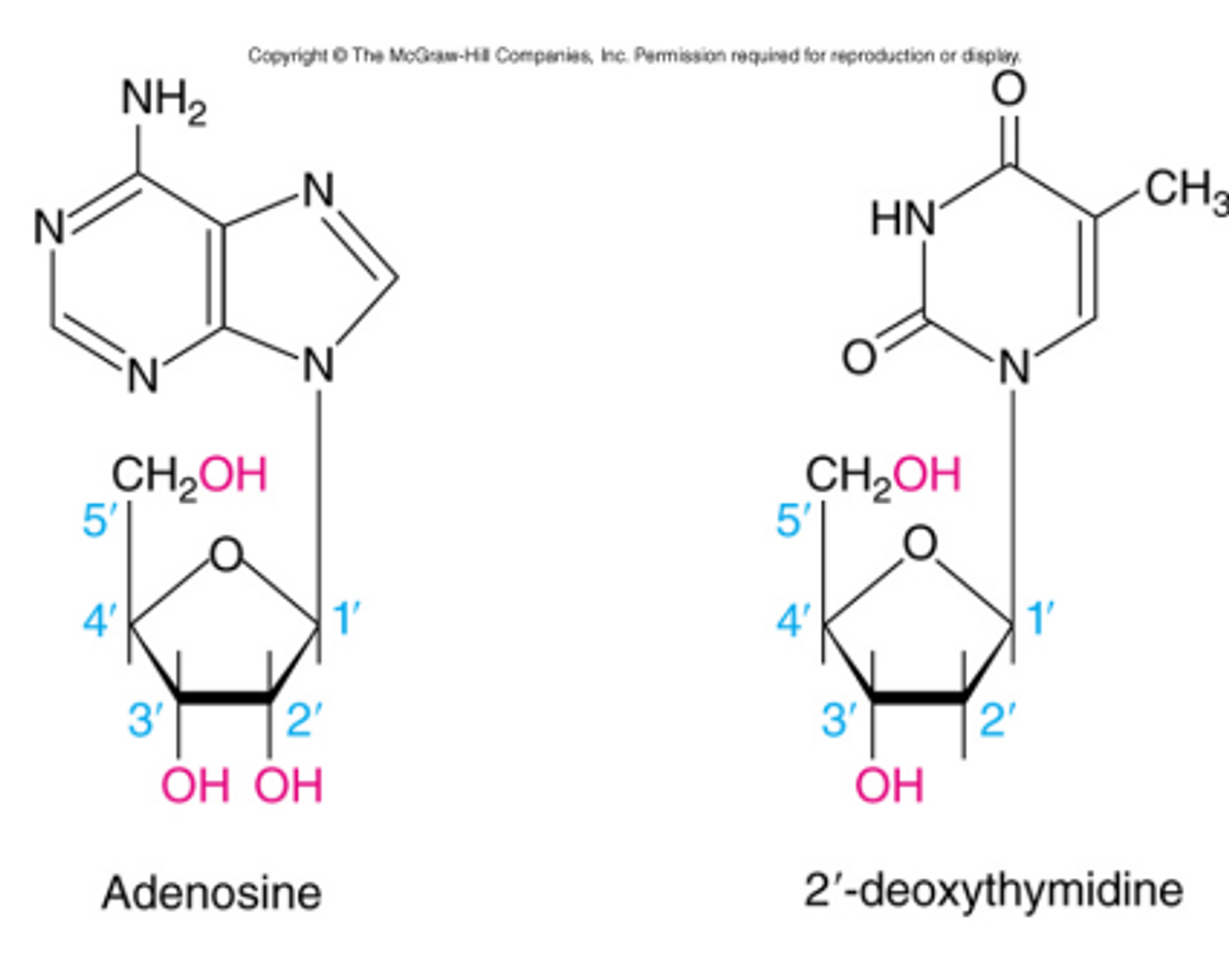 위 그림은 각각 RNA, DNA를 이루는 일부 구성요소인 nucleoside를 나타내고 있음. (nucleoside는 당+염기로 이루어진 구조이며 nucleotide는 당+염기+인산으로 이루어진 구조임) 보면 ribose의 경우 당의 2', 3' 탄소에 모두 OH가 달려있지만 deoxyribose의 경우 당의 3' 탄소에만 OH가 달려있음.