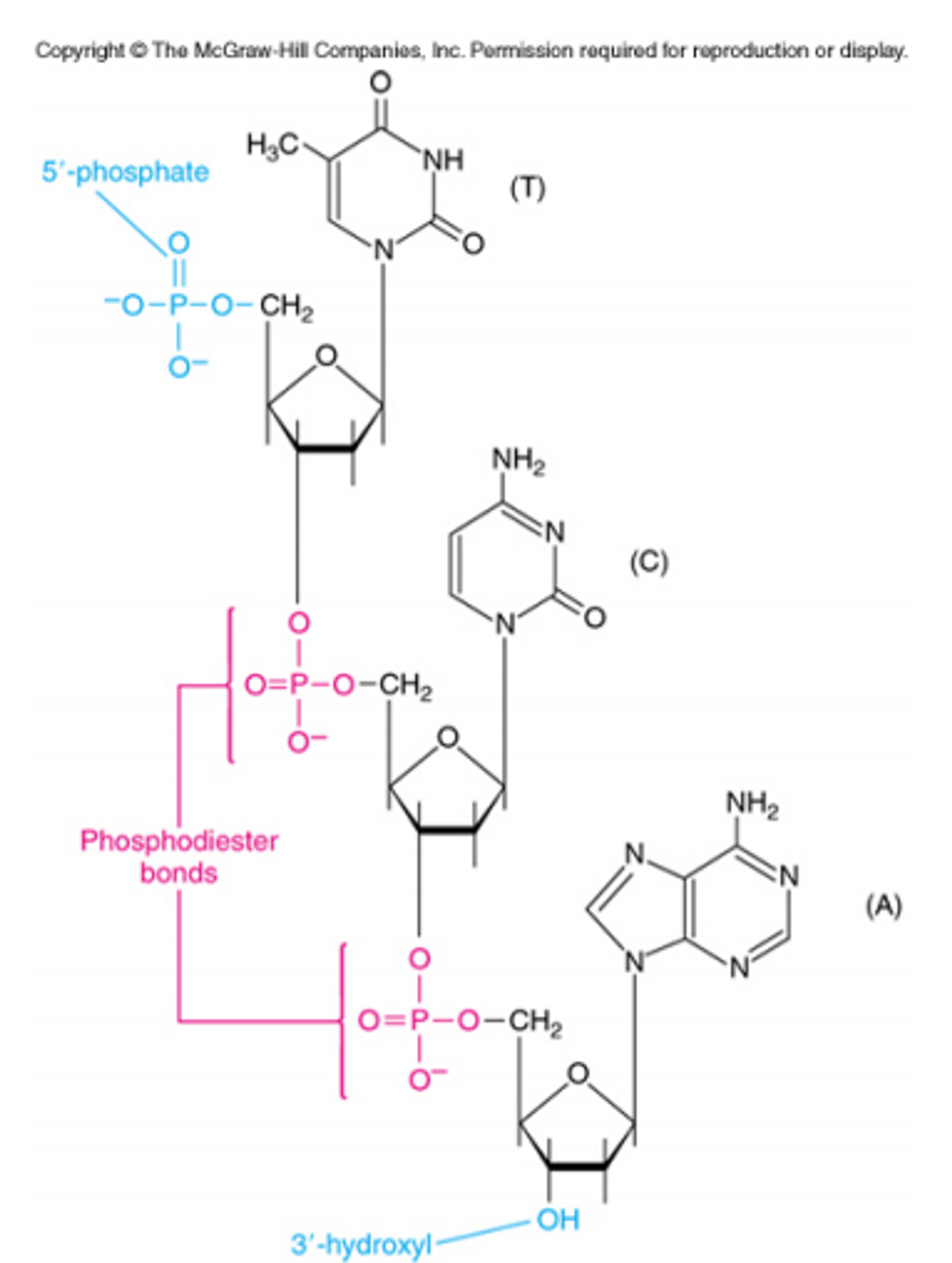 위 그림과 같이 nucleotide 끼리는 phosphodiester bond에 의해 연결됨. 이 때 5' 탄소와 결합한 phosphate 중 맨 끝쪽을 5' end, 3' 탄소와 결합한 OH 중 맨 끝쪽을 3' end라 부르며(따라서 DNA는 5'→3'으로의 방향성을 가지고 있음), 일반적으로 가운데에 위치한 phosphate와 OH 간의 phosphodiester bond에 의해 결합이 형성됨.