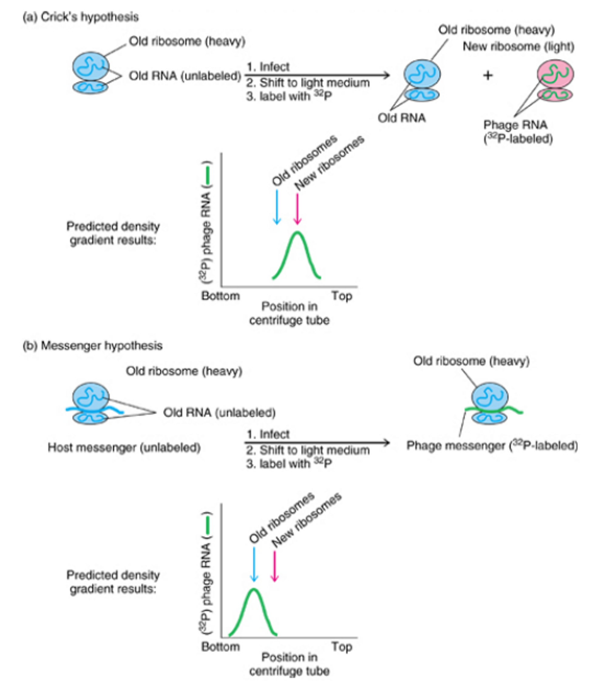 (a)에서 나와있는 것처럼 Crick은 지속적으로 새 ribosome이 생기고 그곳으로 RNA가 운반된다는 생각을 가지고 있었기 때문에 light medium으로 옮겨주게 되면 light ribosome에 RNA가 관찰될 것이라 생각함. (즉, centrifugation 시 top에 가까운 곳에서 32P 신호가 나타날 것이라 생각함)