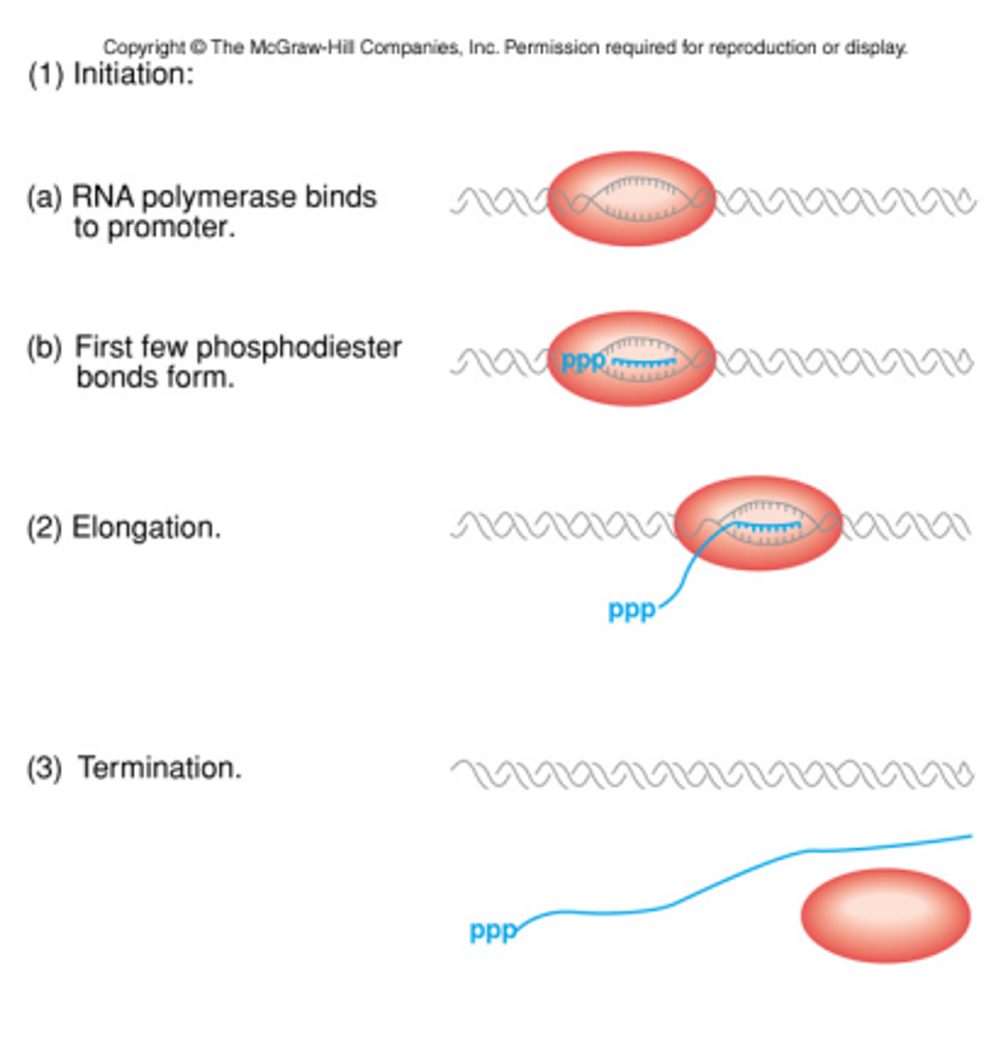 transcription은 initiation, elongation, termination 세 단계로 진행되며 이에 대해 간단히 나타낸 그림이 아래와 같음.