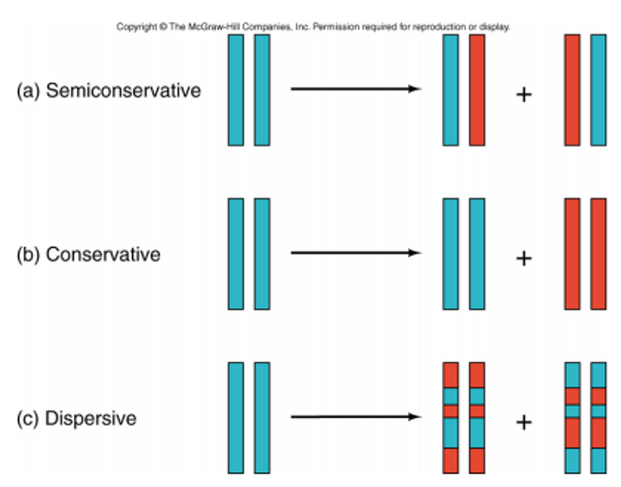 DNA 복제에 대한 수많은 가설들이 있었으나 그 중 위 그림의 (a)에 나타나 있는 semiconservative model이 맞는 model임이 확인됨. 이에 대해서는 차후에 자세히 다룰 것임.