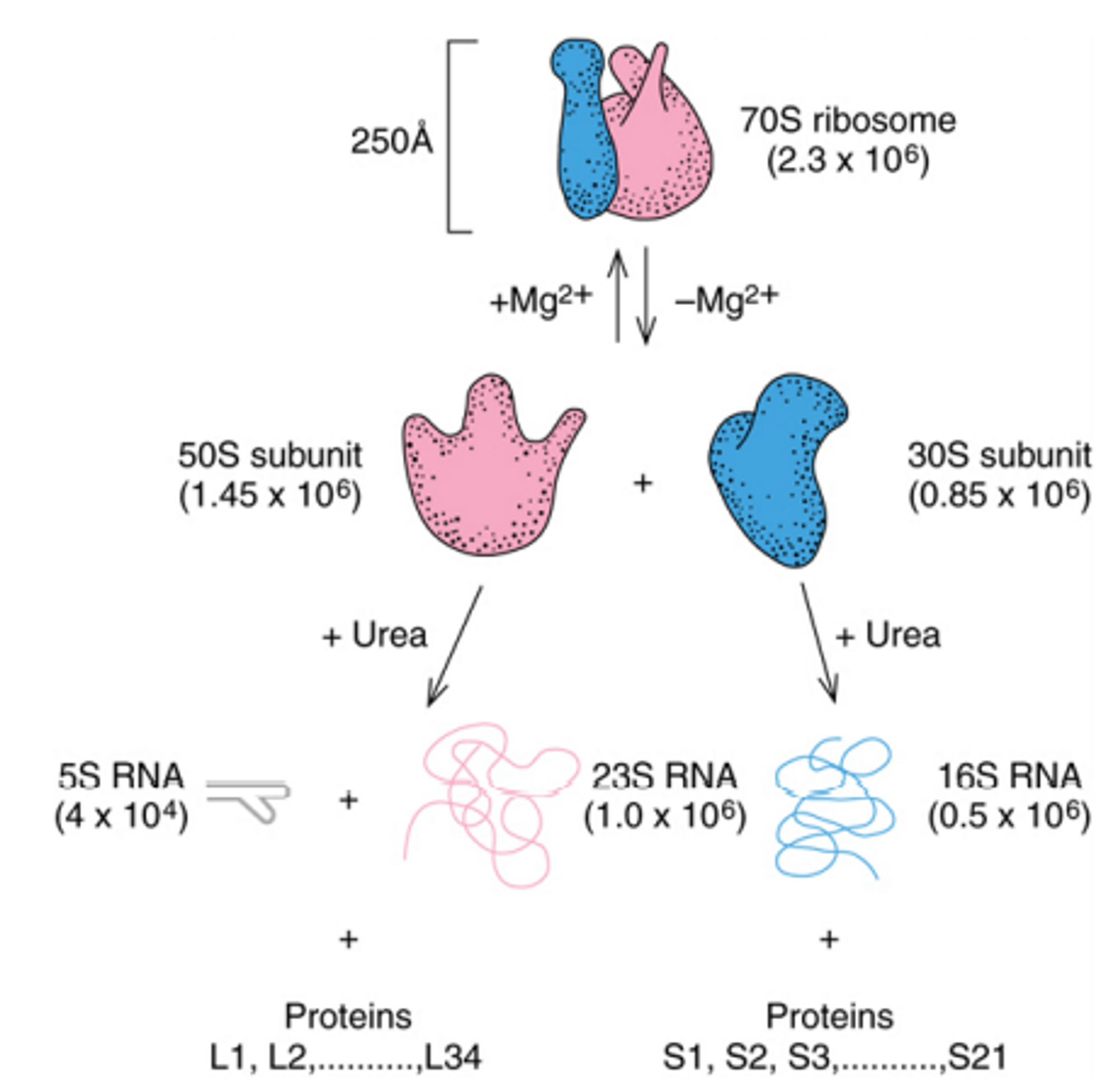 위 그림에 ribosome의 구조가 나타나 있음. 이 때 'S'라는 단위가 눈에 띄는데 이 S는 sedimentation coefficient를 나타내며 ultracentrifugation을 돌렸을 때 차별화되는 입자 고유의 성질임. (S는 shape, weight에 따라 달라짐)