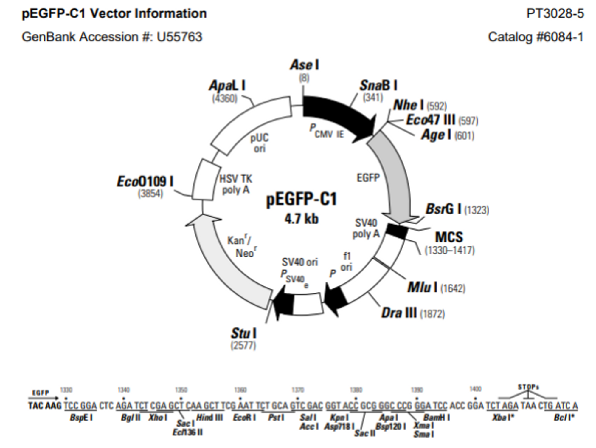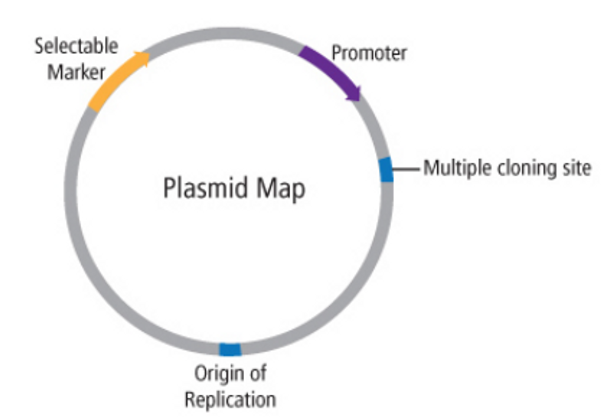 위 그림은 pEGFP-C1이라는 vector를 보여주고 있음. 이 때 ori라 표시된 부분이 origin of replication, Kanr, Neor이라 표시된 부분이 (kanamycin, neomycin에 대해 저항성을 부여해주는) selectable marker, CMV라 표시된 부분이 promoter, MCS라 표시된 부분이 multiple cloning site임.