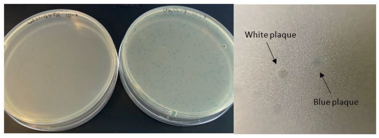 다음으로, plasmid 대신 phage(bacteriophage)를 vector로 사용해줄 수도 있는데, phage를 vector로 사용하는 시도는 실험실에서는 거의 잘 이루어지지 않고 기업 수준에서 많이 이루어지고 있음. (대부분 genomic library를 제작하는 용도로 많이 사용됨) 이 녀석을 vector로 사용했을 때의 장점은 비교적 긴 서열(20kbp정도)을 삽입할 수 있다는 것임. (plasmid를 사용할 경우 일반적으로 3~5kbp정도 이상을 삽입하기 힘듦) 이 경우에는 앞서의 plasmid transformation과는 다르게 clone이 colony 형태로 관찰되지 않고, 그 대신 (phage가 bacteria를 뚫고 나오므로) plaque(플라크)가 관찰됨.