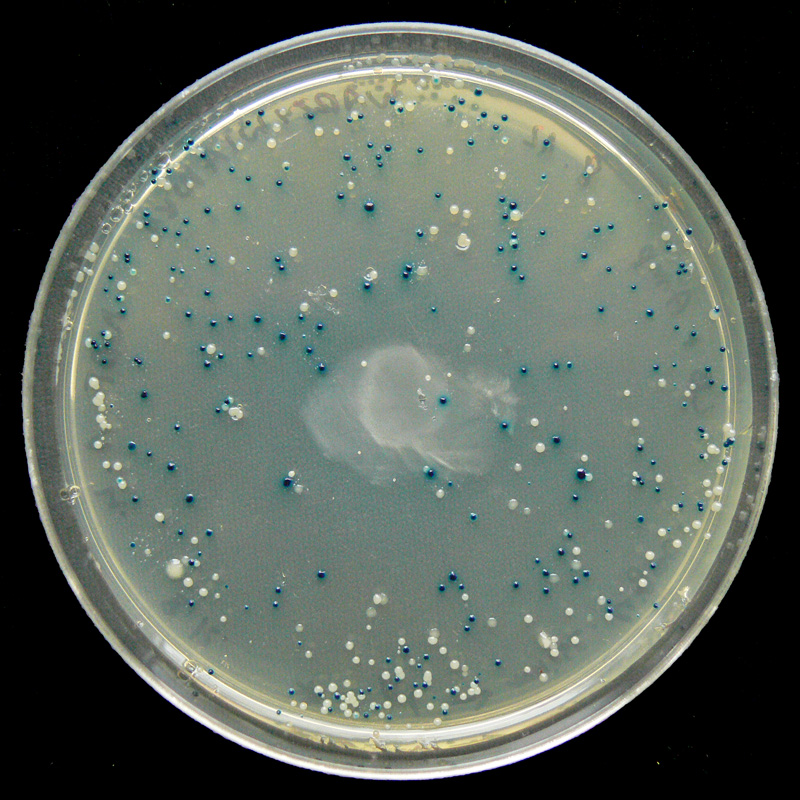 한편, 또 많이 사용되는 selectable marker가 바로 beta-galactosidase를 encoding하고 있는 lacZ라는 gene을 삽입해주는 방법임. 이 경우 특히 lacZ를 MCS 사이에 넣어주게 되는데, 이렇게 되면 재조합이 일어날 시 lacZ gene이 갈라져서 기능을 잃으므로, 표현형 관찰을 통해 우리가 원하는 gene에 대한 재조합 여부를 판단할 수 있음. 조금 더 구체적으로는 X-gal이라는 beta-galactosidase indicator를 넣은 media에 bacteria를 키웠을 때 lacZ가 정상적으로 발현된 경우에는 beta-galactosidase의 활성에 의해 X-gal이 절단되고, 그 결과 blue colony가 관찰됨. 한편 우리가 원하는 DNA의 재조합이 일어나서 lacZ가 정상적으로 발현되지 않은 경우 white colony가 관찰됨. (따라서 white colony만을 선택적으로 키우면 우리가 원하는 유전자가 재조합된 bacteria만을 선별적으로 키울 수 있음)