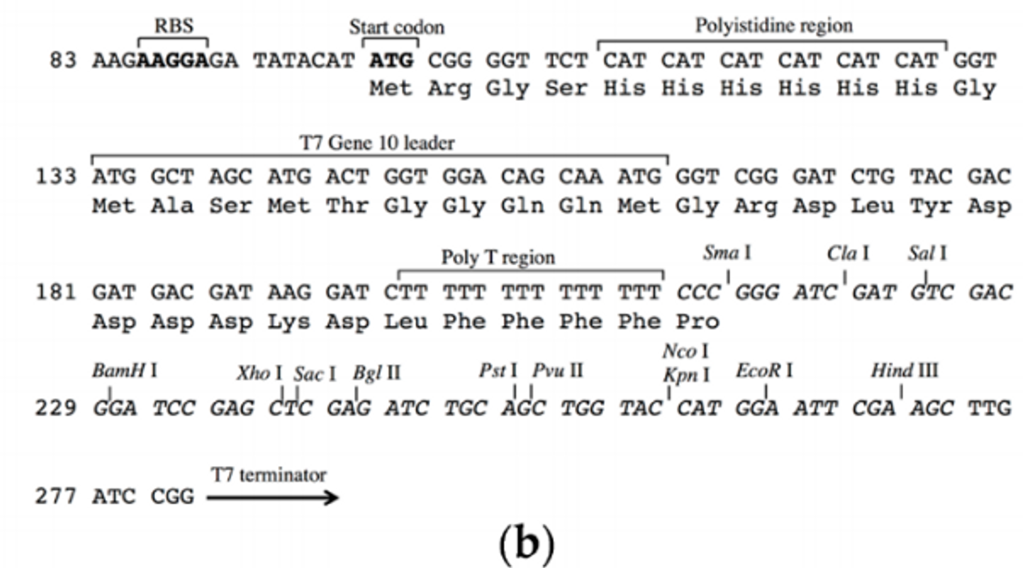 이 때 2종류의 제한효소를 사용하므로 우리가 끼워넣기를 원하는 위 서열의 양쪽에도 제한효소에 의해 잘릴 수 있는 부위를 만들어 주어야 함. 이 때 또 고려해야할 사항이 있음. 만약 우리가 gene의 발현결과를 보고 싶다면 전사, 번역 과정에 대한 고려도 해야 함. 이 때 plasmid의 promoter 부위로부터 삽입되는 부위는 꽤나 떨어져 있음. 따라서 이 때 (b) 그림에서 3개씩 나눠놓은 순서에 맞게 gene이 삽입되어야 함. (즉, gene의 ATG 부위가 딱 (b) 그림에서의 3칸에 맞게 삽입되어야 함) 예를 들어 우리가 EcoRI을 앞쪽 절단효소로 쓰고자 할 때 EcoRI은 GAATTC를 인지하므로 추가적으로 GAATTC 부분을 gene의 앞에 붙여주고 제한효소를 이용하여 삽입해주게 되면 칸수가 맞지 않게 삽입됨. (GGA ATT CAT GCC ...) 이럴 경우 우리가 원하는 결과물이 합성되지 않을 수 있으므로 frame을 맞춰주기 위해 삽입하는 서열에 GAATTCXX와 같은 식으로 두 개의 임의의 nucleotide를 더 첨가해주어야 함.