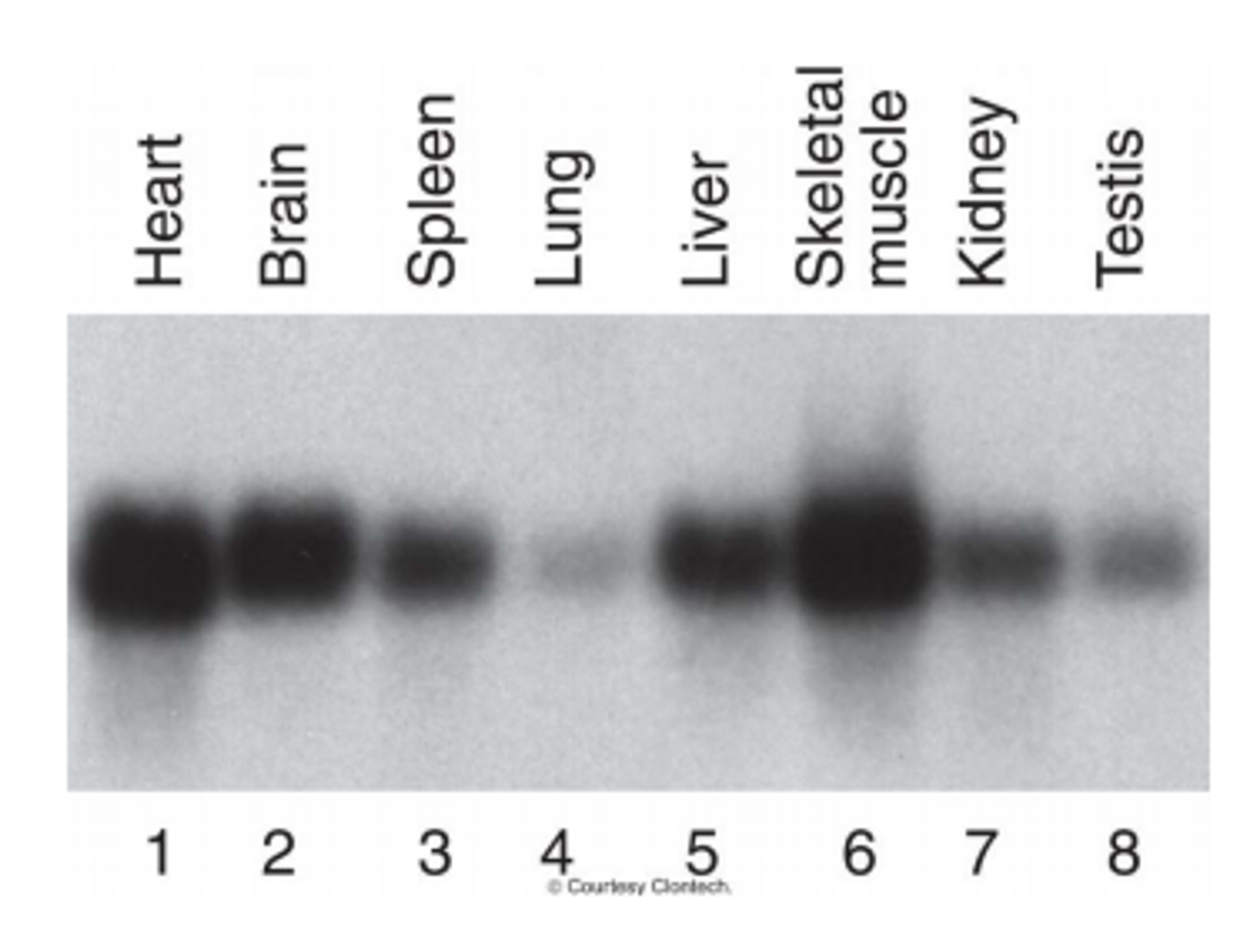 우선 다양한 조직들로부터 RNA를 얻은 후 RNA를 gel에 loading한 다음 서던 블롯에서와 동일한 방법으로 membrane으로 옮겨줌. 이후 우리가 관찰하고자 하는 RNA가 어느 정도 존재하는지를 보아야 하므로 probe(탐침)를 써야 하는데, 이 때는 일반적으로 우리가 관심있는 RNA에 상보적으로 결합할 수 있는 cDNA를 probe로 사용함.