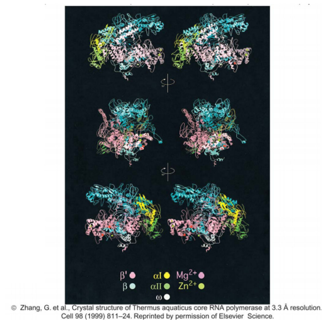 한편 X-ray crystallography를 이용해서 core polymerase의 구조를 실제로 파악할 수 있음. 이 때 core polymerase와 같이 작용하는 각종 ion들이 어디에 위치하는지(예를 들어 Mg2+는 Asp 쪽에 위치) 등도 알 수 있음.