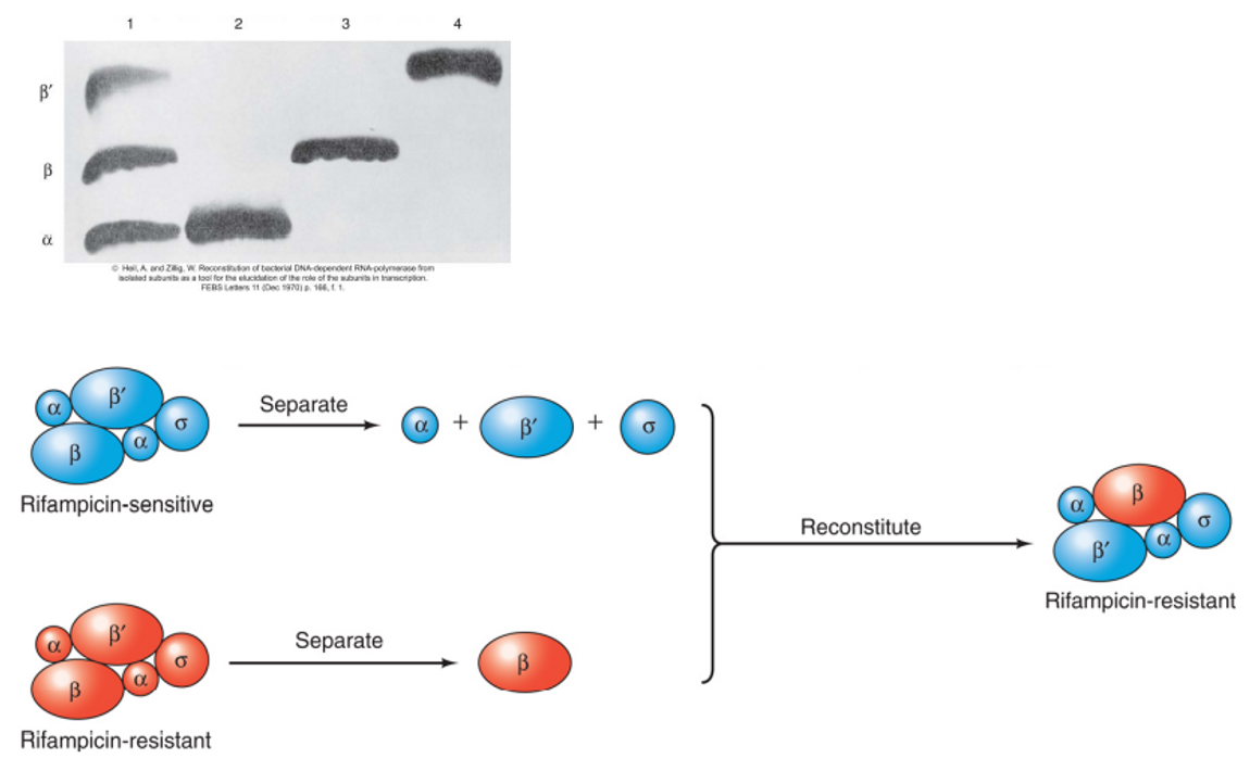 이 때 Rifampicin-sensitive한 종에서 분리한 RNA polymerase로부터 alpha, beta', sigma subunit을 분리한 후 Rifampicin-resistant한 종에서 분리한 RNA polymerase로부터 \beta subunit을 분리하여 이들을 다시 reconstitute해 줄 경우 새로 생성된 RNA polymerase도 Rifampicin-resistant하다는 것을 알 수 있음. 따라서 이 결과를 통해 beta subunit이 Rifampicin에 대한 저항성을 부여한다는 것을 알 수 있음.