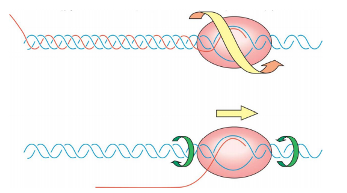 그런데 위 그림처럼 elongation 과정에서 DNA 가닥이 계속해서 일시적으로 풀리게 되므로 남아있는 upstream의 DNA 가닥들은 잘못하면 RNA와 꼬여 매우 이상한 구조를 형성할 수도 있음. 이를 방지해주는 역할을 하는 것이 topoisomerase이며, topoisomerase의 활성에 의해 위 그림 아래와 같이 과꼬임이 방지됨.