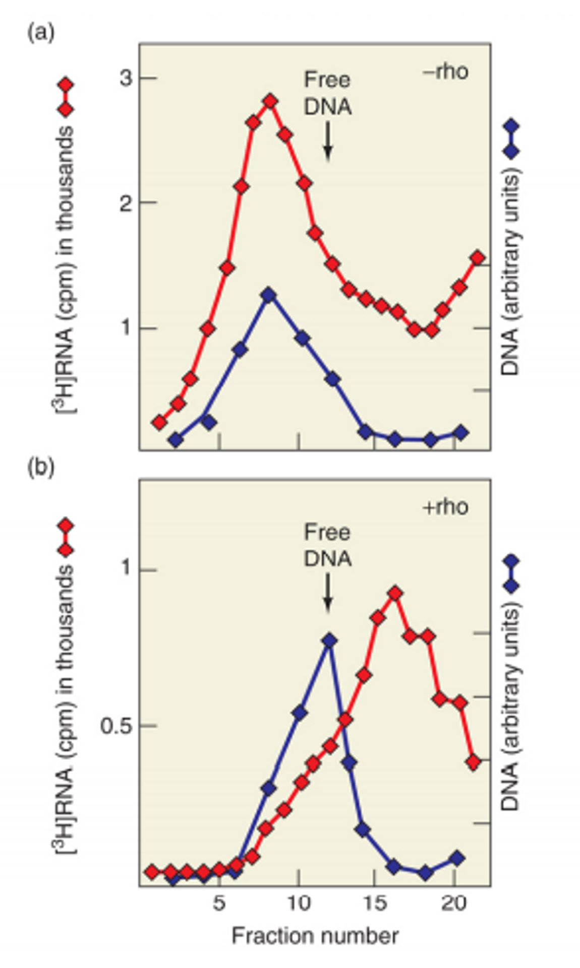 한편 위 그림에서 나타난 실험도 rho factor의 기능을 알아보기 위해 수행한 ultracentrifugation 결과임. 이 때는 DNA와 RNA의 size별 distribution을 관찰함. 이 때 파란색 선은 DNA를, 빨간색 선은 RNA를 나타냄.