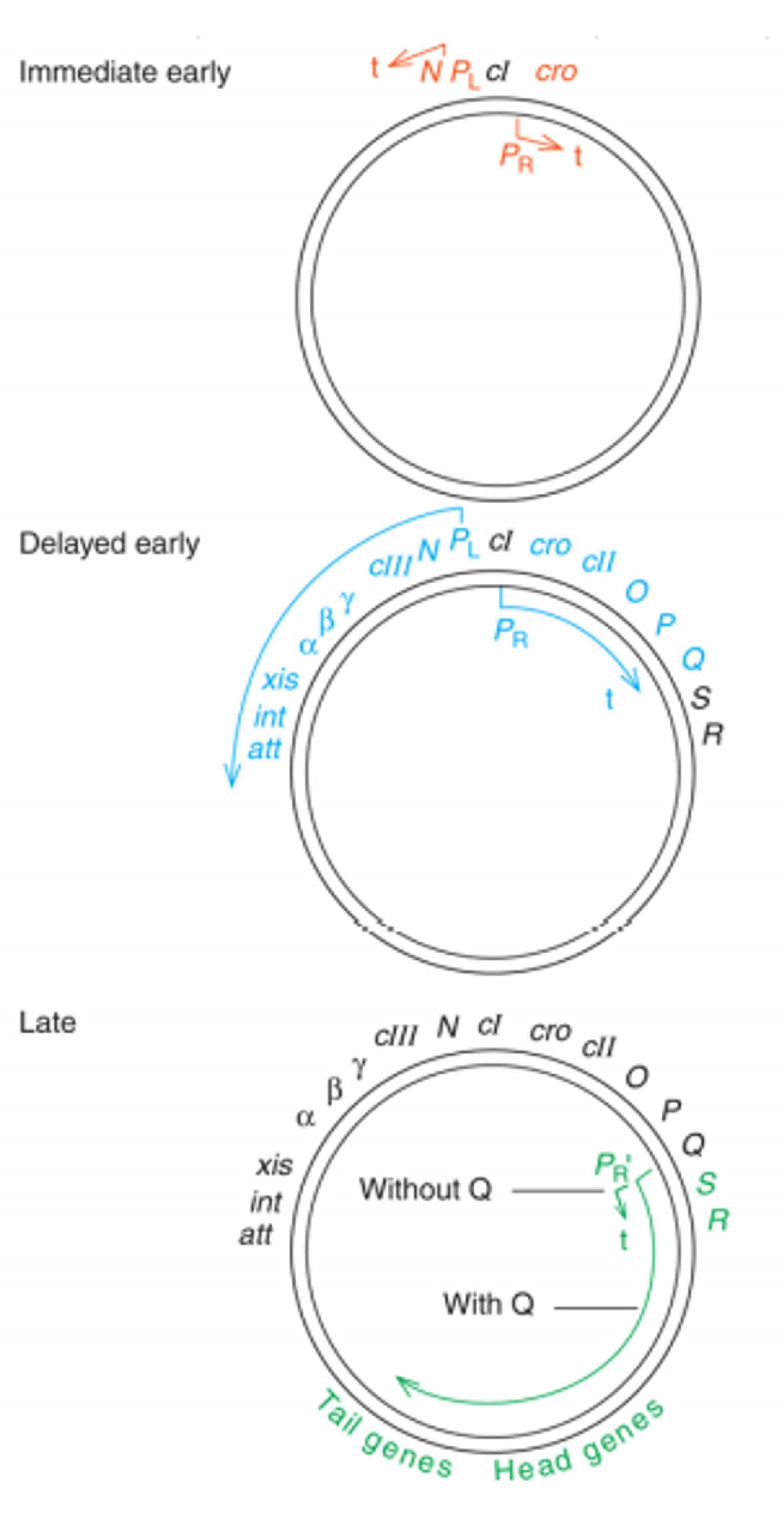 delayed early state에서 Q gene에 의해 발현된 Q protein은 N과 마찬가지로 antiterminatior로 작동할 수 있음. 그 결과 late state로 넘어가게 되는데, 이 때 그림에서도 나와있는 것과 같이 PR' promoter로부터 시작된 전사가 Q에 의해 조기종결되지 않고 tail gene까지 쭉 전사되는 것을 볼 수 있음.