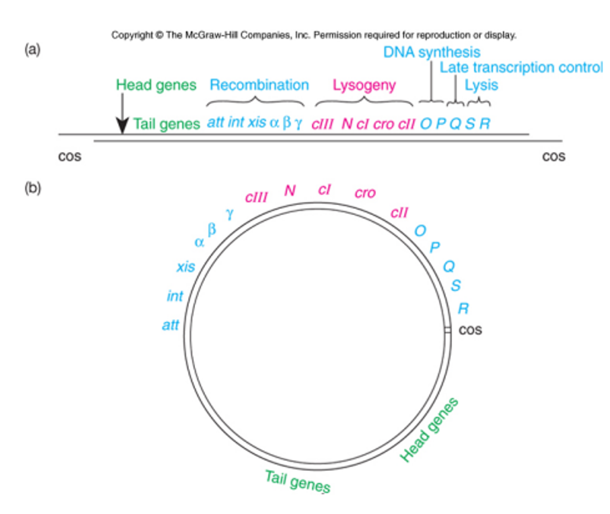 이 때 붉은색으로 나타난 부분이 immediate early gene, 파란색으로 나타난 부분이 delayed early gene, 녹색으로 나타난 부분이 late gene임. (참고로 (a)는 virion 상태의 lambda phage가 가지고 있는 선형의 유전체를 나타내고 있으며, 이 때 양 쪽 말단에 cos[cohesive] end가 존재하고 있음을 알 수 있음. 이 cos end에 의해 host cell에 들어가게 되면 (b)에서와 같이 circular DNA를 형성할 수 있음)