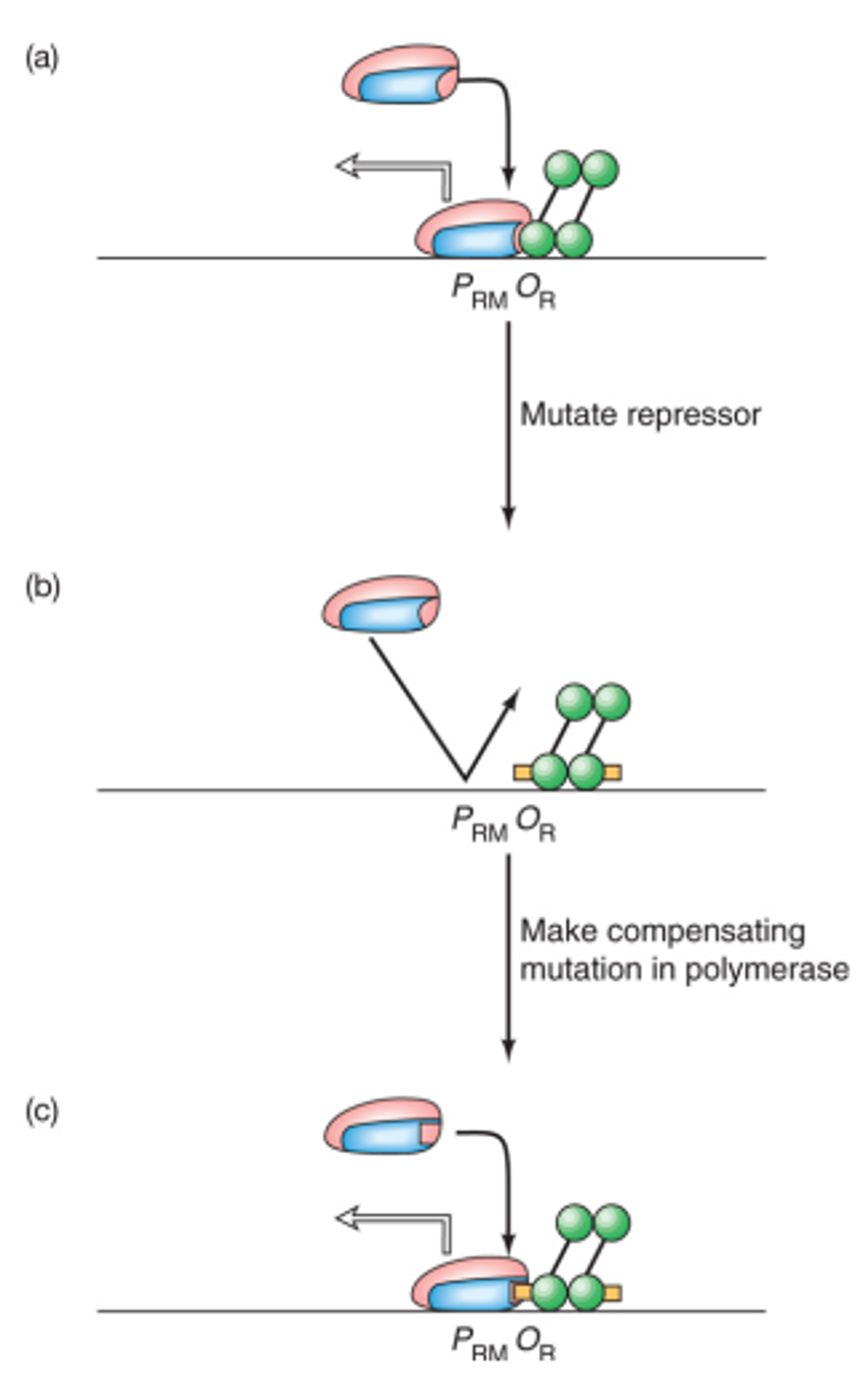 그런데 아주 희박한 확률로 (c)와 같이 RNA polymerase와 \lambda repressor가 binding하는 site 자체에도 mutation이 생겨서 mutant lambda repressor와 결합할 수 있는 RNA polymerase가 생기는 경우 전사가 일어날 수 있을 것임. 이처럼 이미 생긴 mutation의 영향을 극복하는 mutation을 intergenic suppression이라 함.