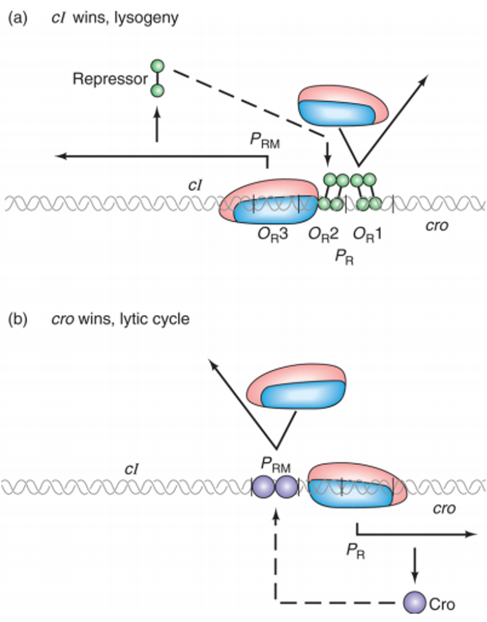 만약 cI이 cro를 overcome한다면 (a)와 같이 lambda repressor가 cro의 전사를 막아 lysogenic cycle로 진입할 것임. 만약 cro가 cI을 overcome한다면 (b)와 같이 Cro가 PRM에 결합한 후 repressor로 작동해 (일종의 blocker로 작동) cI의 전사를 막아 lytic cycle로 진입할 것임.