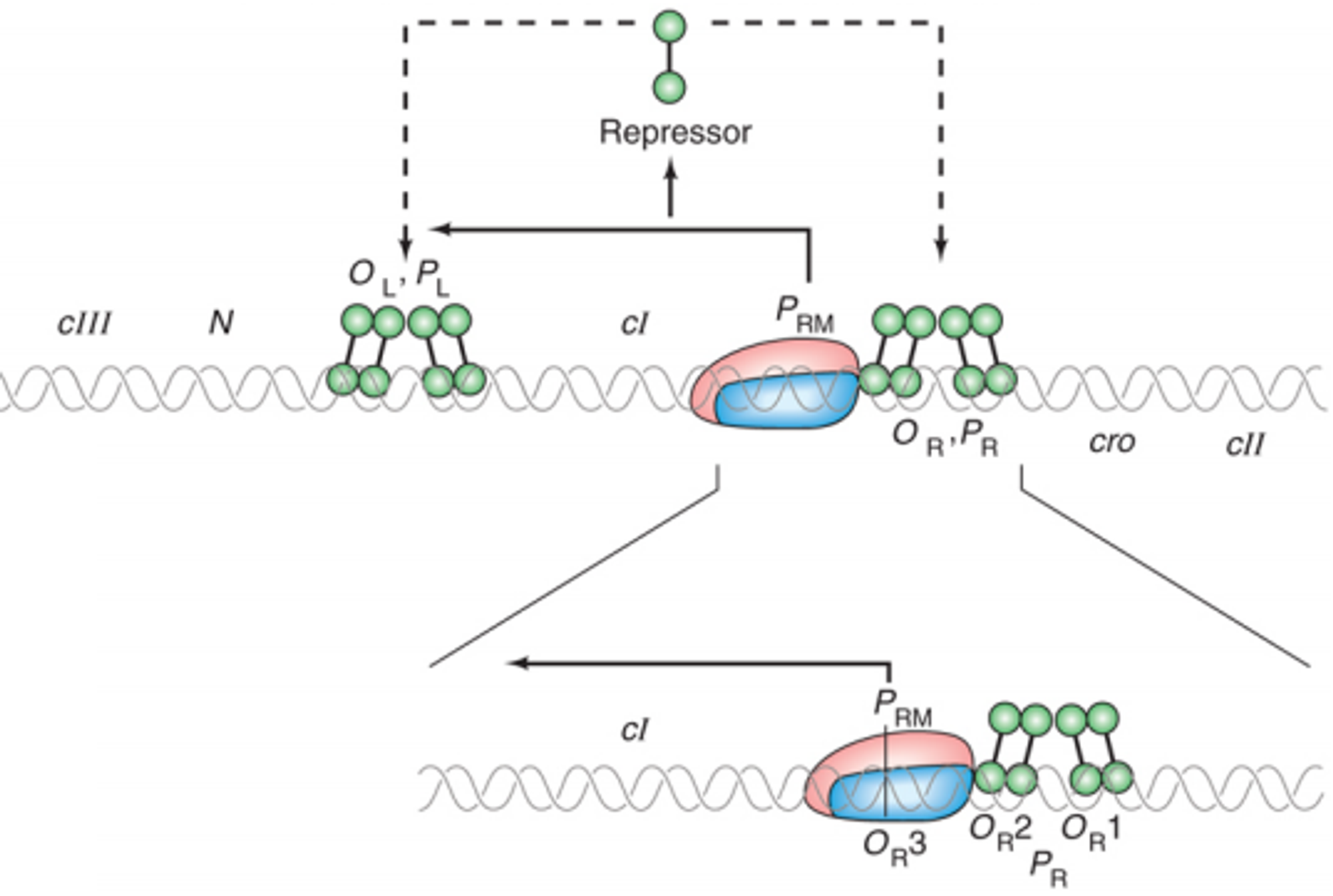 이와 동시에 OL, OR에 붙은 \lambda repressor들은 PL, PR에 RNA polymerase가 제대로 못 붙도록 방해하는 lambda repressor로의 역할도 수행함.