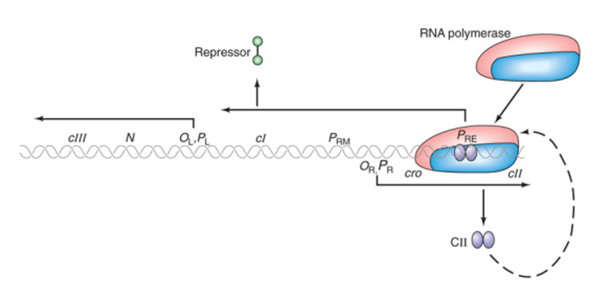 그 과정이 위 그림에 나타나 있음. 보면 cII가 어느 정도 누적될 시 cII는 PRE에 붙어 위 그림상 왼쪽 방향으로의 전사를 촉진함. 이 때 전사의 방향이 PR에 의해 유발되는 전사의 방향과는 반대방향임. (즉, cII가 일종의 activator로 작용해 PRE에 RNA polymerase가 잘 붙고 전사할 수 있게 만들어줌) 참고로 이 때 RE는 repressor establishment를 의미함.