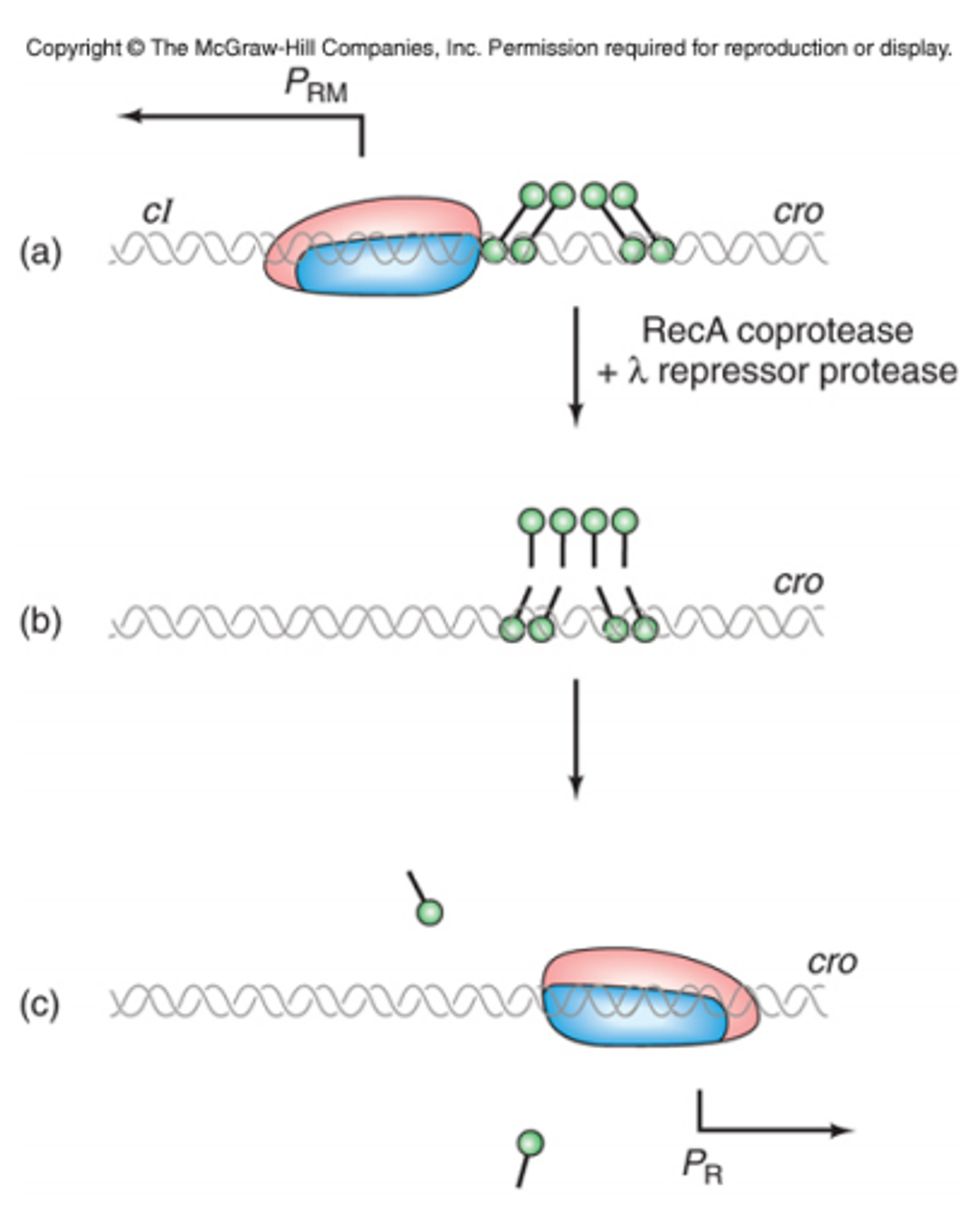 SOS response의 결과 RecA coprotease와 lambda repressor protease 등이 발현되면 위 그림과 같이 lambda repressor가 다 분해됨. 그 결과 더이상 lambda repressor가 작동하지 못하므로 PR에 RNA polymerase가 붙어 cro gene이 전사되게 되고, 결국 lytic cycle로 진입해 세포를 lysis시키며 밖으로 나가게 됨.
