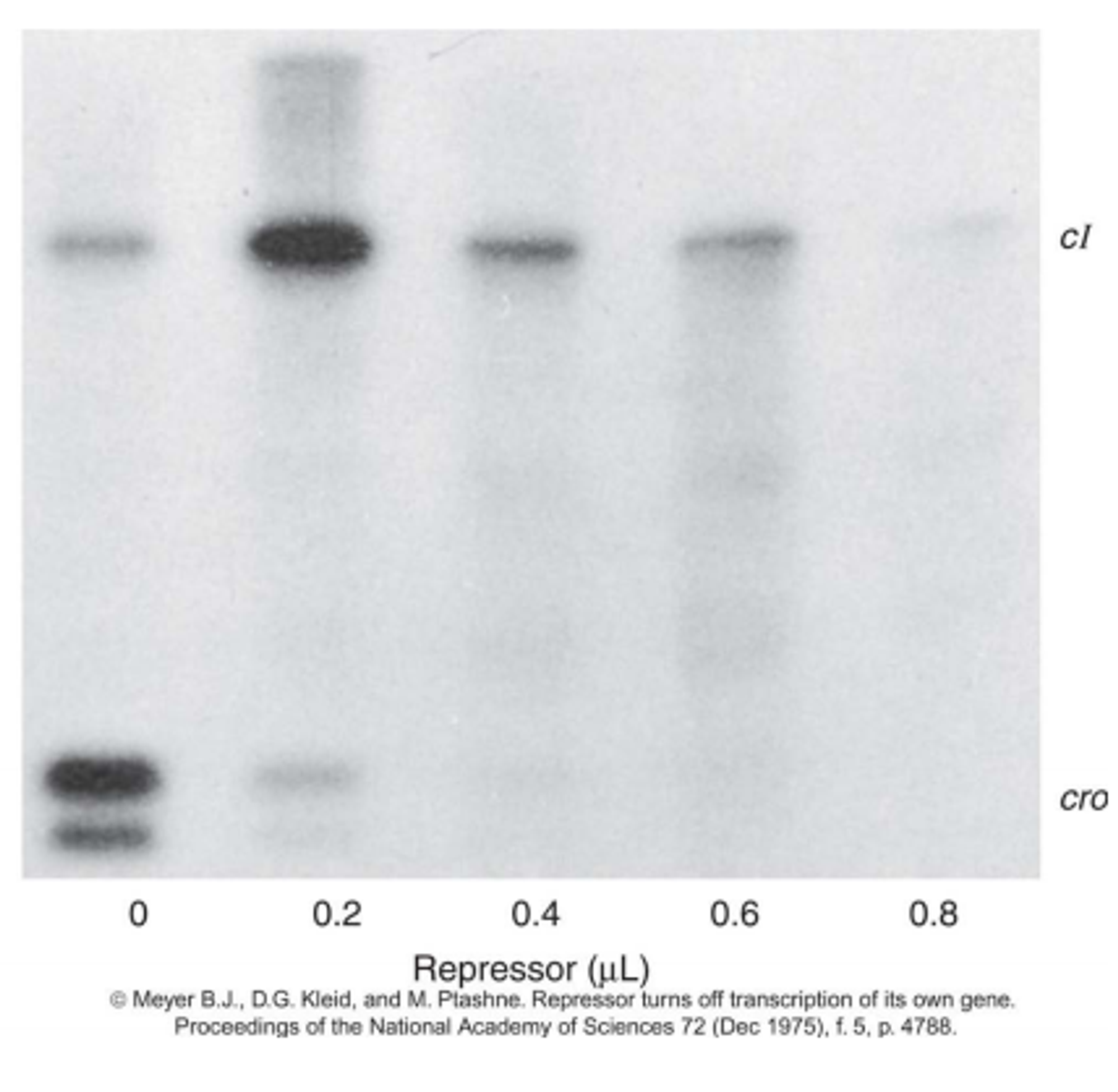 위 실험 결과를 보면 lambda repressor의 양을 늘리면 늘릴수록 cro의 발현양이 감소함을 알 수 있음. 그런데, 위 결과에서 c1의 발현양도 처음에는 증가하지만 이후 감소하는 것을 볼 수 있음. 이는 autoregulation의 결과로, 조금 더 자세한 내용은 곧이어 살펴볼 것임.