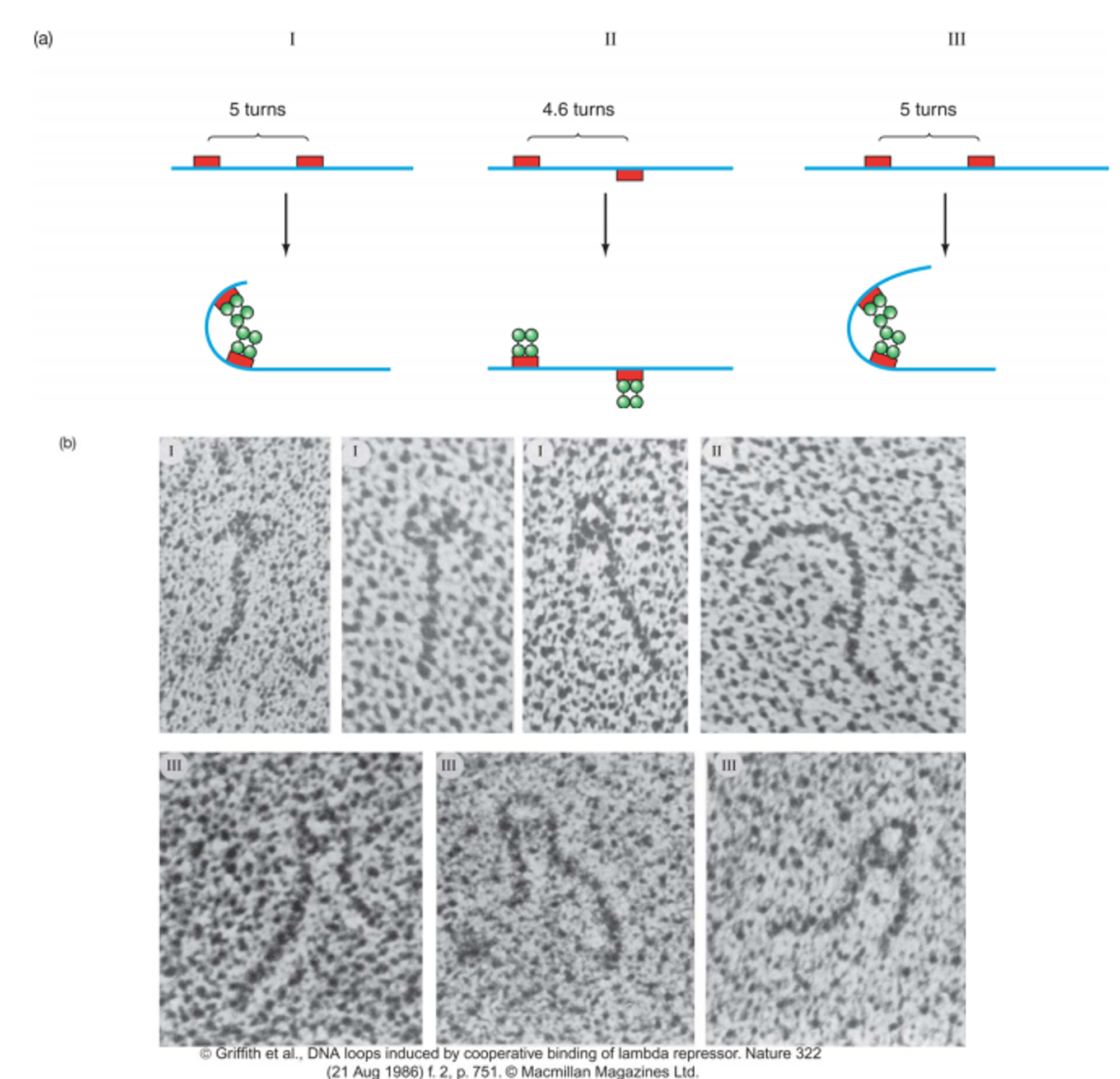 한편 고해상도의 전자현미경(EM)을 이용하게 되면, DNA의 loop 형성 여부, 모양 등을 실제로 관찰할 수도 있음. 보면 I, III의 경우 EM으로 관찰할 시 loop이 형성되지만 II의 경우 loop이 형성되지 않음을 확인 가능함. (당연히 II의 상황에서 제대로 된 loop가 형성되지 않는 것은 protein-binding DNA들 사이에 위치한 DNA의 helical turn이 10.5의 정수번 일어나지 않았기 때문)