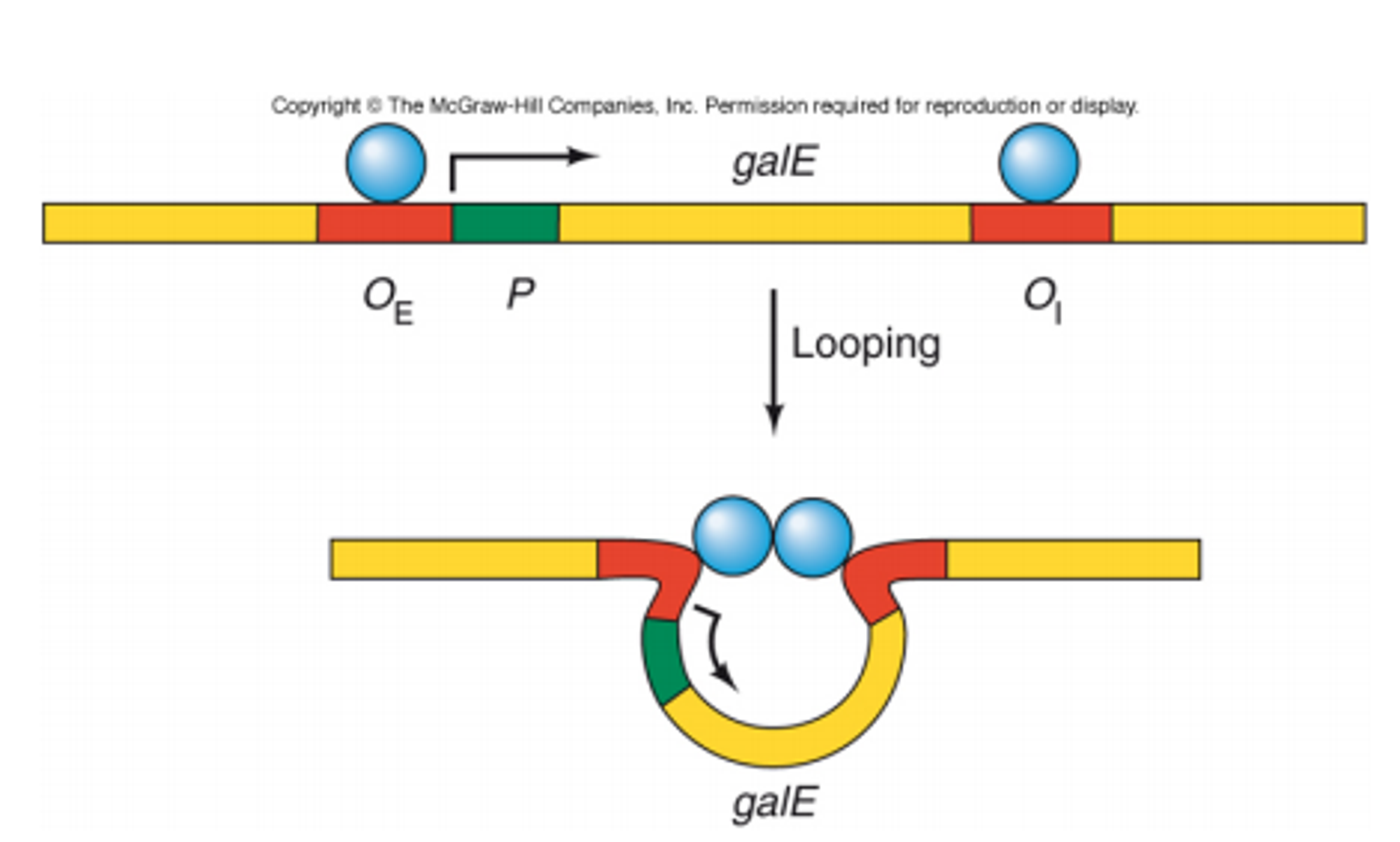 위 그림은 gal operon에서 OE와 OI에 붙은 단백질들끼리 서로 어떻게 상호작용하는지를 나타내주고 있음. 보면 앞서 살펴본 것과 유사하게 loop를 형성하여 transcription initiation에 도움을 주게 됨.