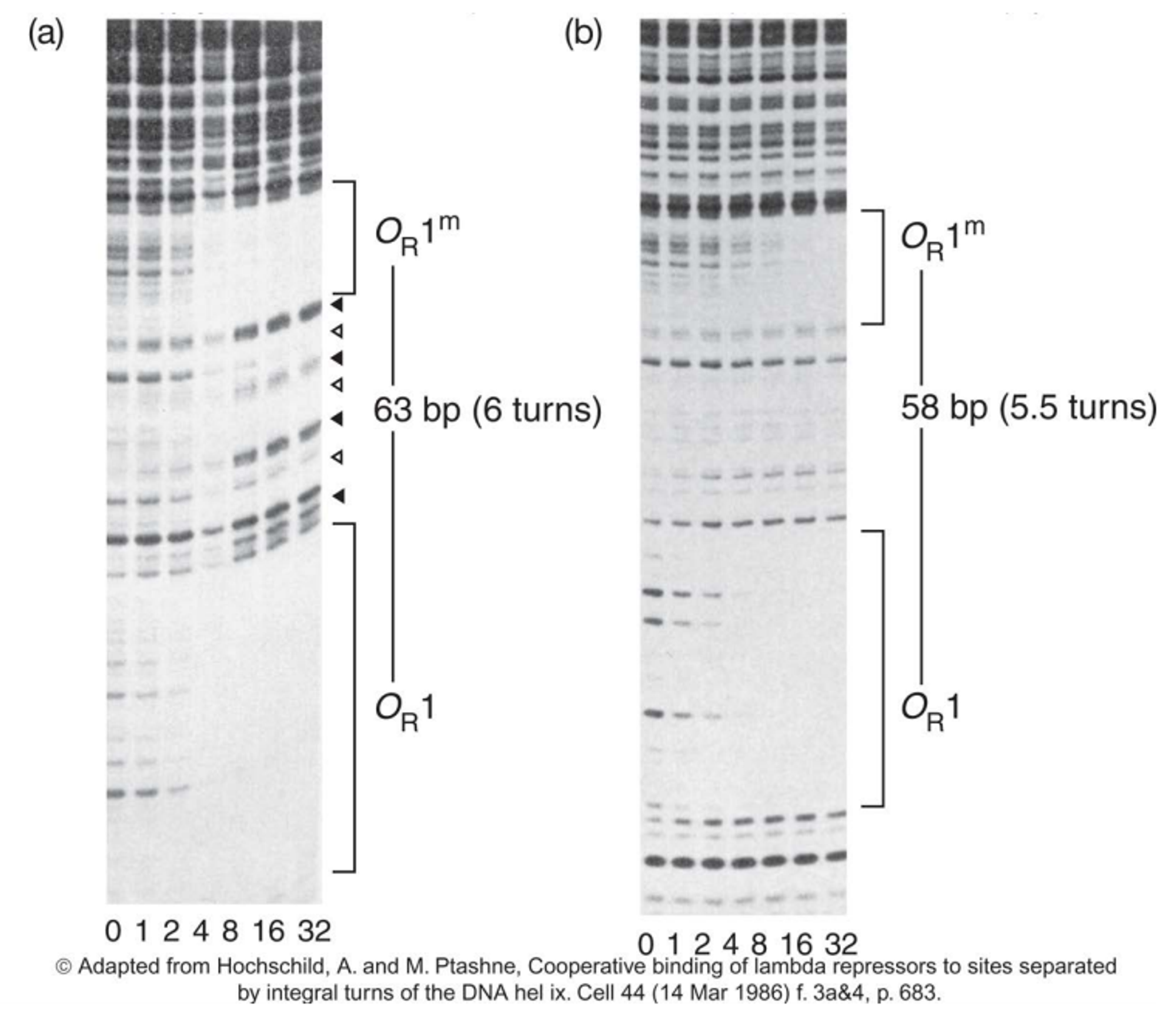 우선 (a)부터 살펴보자. 이 때는 OR1과 OR1m 사이에 정확히 6개의 DNA helical turn이 일어난 경우임. 그리고 오른쪽 lane으로 갈수록 점차 OR1과 OR1m에 붙는 protein들을 많이 넣어주었음. 이 때 당연히 DNA footprinting의 원리에 의해 OR1과 OR1m부분에서는 band가 나타나지 않음.