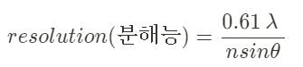 이 때 분해능을 작게 만들 수 있는 대표적인 방법이 바로 사용하는 빛의 파장 λ를 작게 만들어주는 거죠.