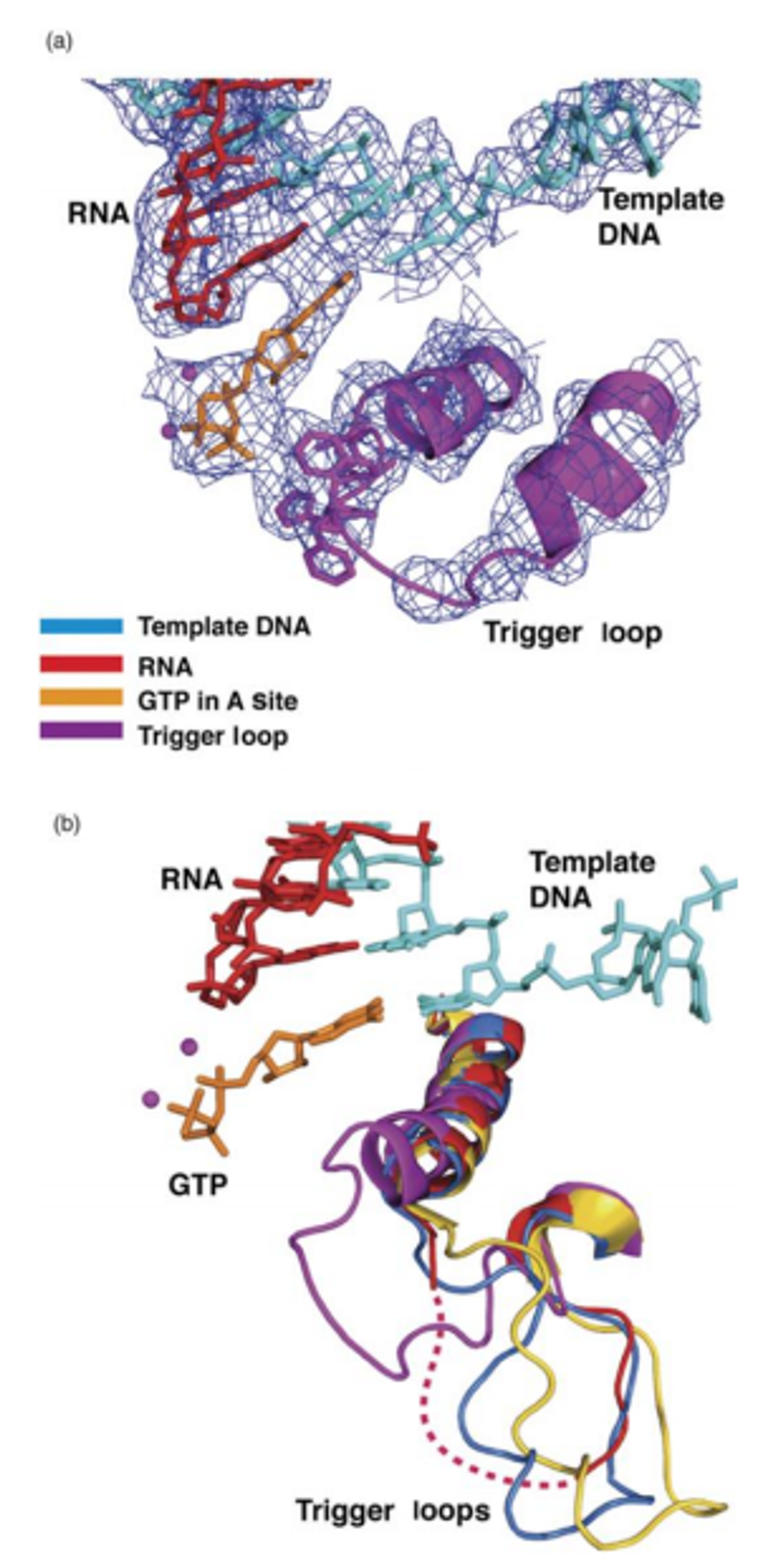 위 그림의 아랫부분에 색깔별로 trigger loop의 다양한 모양이 나타나 있음. 이 중 template DNA와 상보적인 nucleotide(이 경우에는 GTP)가 들어왔을 때에 비로소 trigger loop이 가장 안정적인 형태로 전환되게 됨. (위 그림상의 보라색 구조와 같이 마치 품어주는듯한 구조를 형성하게 됨)