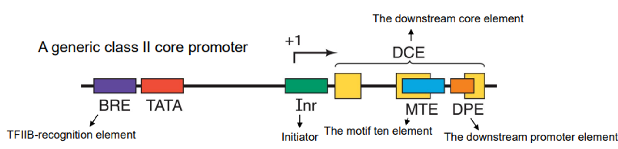 지금까지 core promoter element에 포함되는 TATA box에 대해 알아봄. 그런데 core promoter element에는 TATA box 뿐만 아니라 TFIIB recognition element(BRE), Initiator(Inr), Downstream promoter element(DPE), Downstream core element(DCE), Motif ten element(MTE)등이 있음.