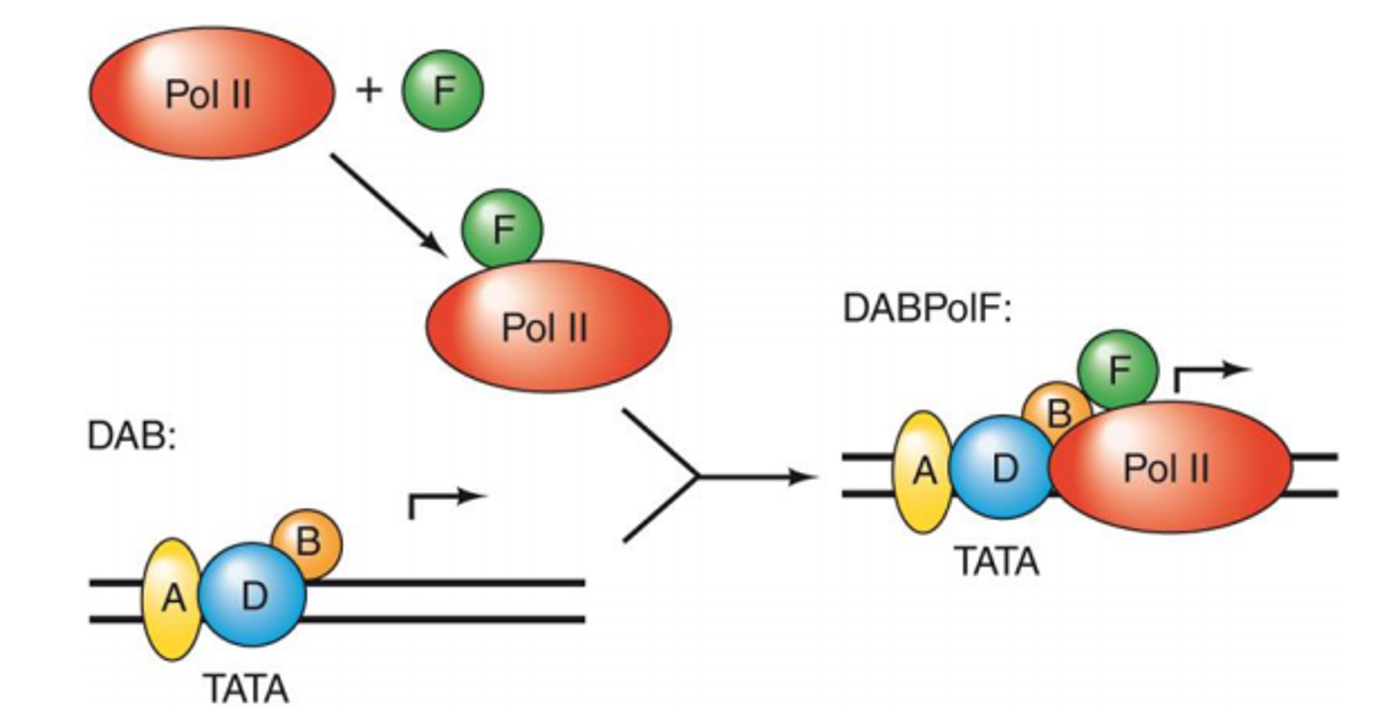 TAF는 core promoter element나 gene-specific transcription factor 들과 interaction함. 따라서 TBP와 함께 TAF가 붙으면 TBP가 붙는 TATA box 영역보다 더 확장된 DNA-protein interaction 영역이 생기게 됨. (즉, TAF는 DNA와의 interaction이 더 넓게 일어나게 도와줌)