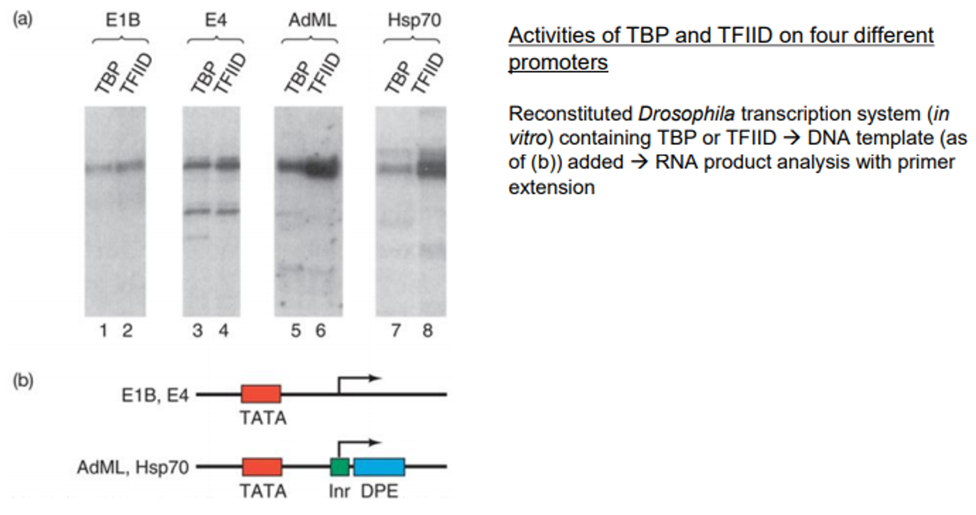 (a)에 나타난 결과를 살펴보자. 우선 E1B와 E4을 promoter로 가지는 gene에서는 TBP만 있을 때와 TBP+TAF일 때의 전사 level이 거의 비슷함. 반면 AdML과 Hsp70을 promoter로 가지는 gene에서는 TBP만 있을 때에 비해 TBP+TAF일 때의 전사 level이 훨씬 더 높아짐.