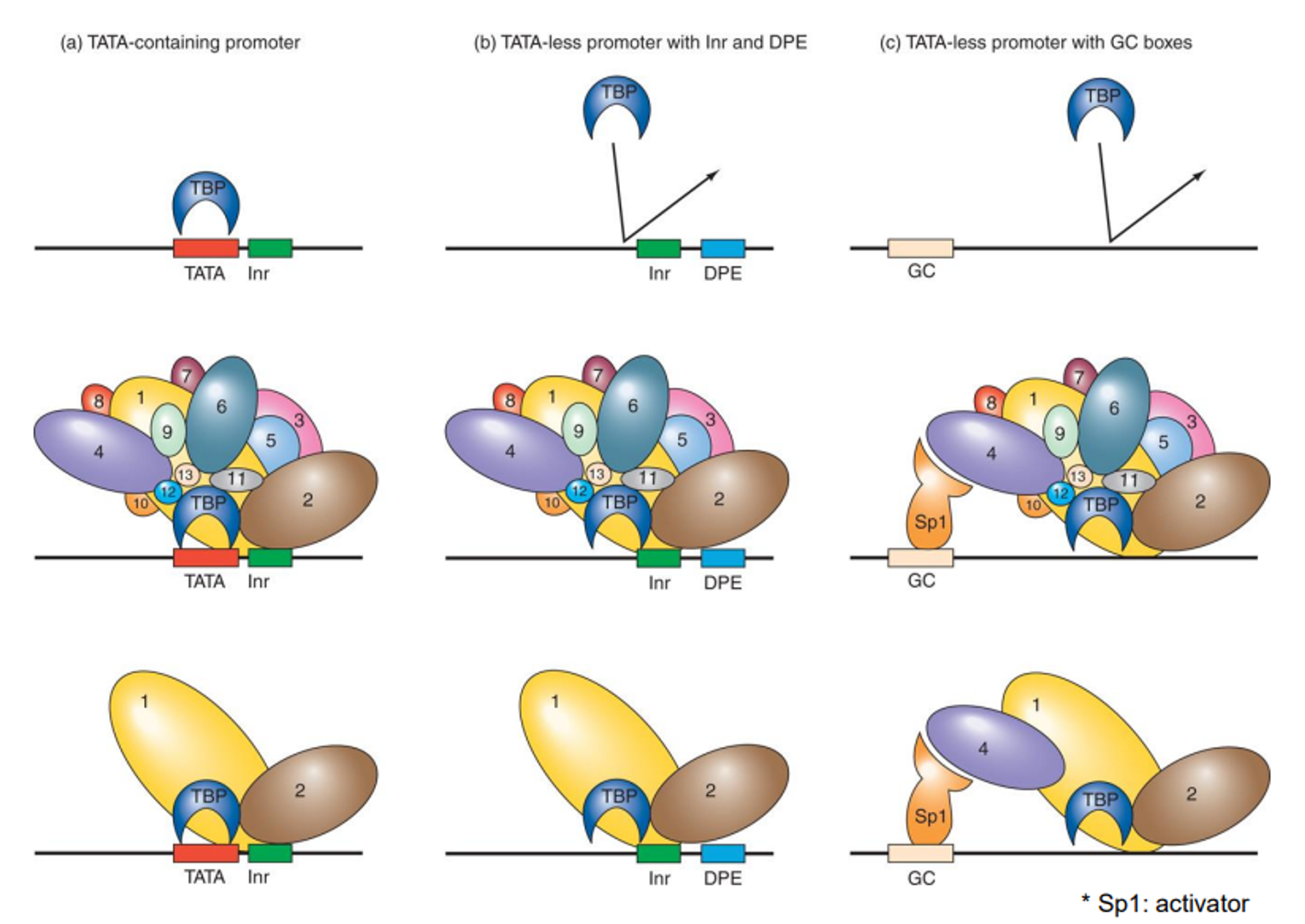 마지막으로 (c)를 살펴보자. 이 경우 promoter에 GC box만 존재함. 이 경우 직접적으로 TBP, TAF1, 2가 붙을 수 있는 DNA region은 없음. 그럼에도 Sp1이라는 activator에 의해 GC box가 인식되고, Sp1이 TAF 4와 결합함에 이어, TAF4가 TAF1, 2, TBP를 비롯한 나머지 TAF들을 다 불러모으게 되어서 결과적으로 이 경우에도 완전한 TFIID가 형성됨.