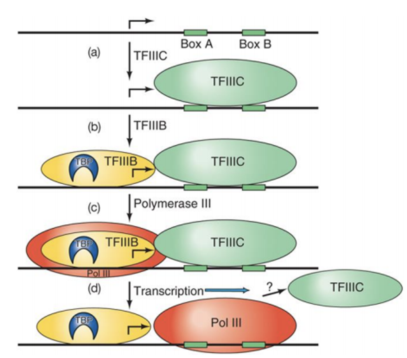 이 때 전사가 진행됨에 따라 RNA polymerase III가 앞으로 나아가면 아마도 TFIIIC는 떨어져 나가는 것처럼 보임. (그러나 이는 아직 명확하지 않음) 한편 위 그림 맨 아래에도 나타나 있듯 TFIIIB는 일단 한 번 붙고 나면 계속 붙어있게 되고, 이후 다음 class III preinitiation complex가 형성되기를 기다리고 있게 됨.