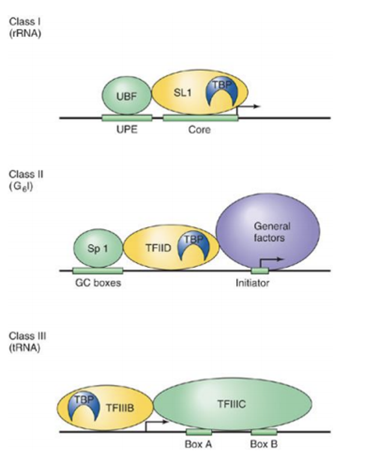 지금까지 배운 내용들을 정리해보자. 위 그림에는 전형적인 class 1, 2, 3 promoter 부분에 생성되는 complex들을 보여주고 있음. (물론 class II의 경우 TATA box가 없고 GC box만 있는 독특한 상황만을 나타내주고 있음)