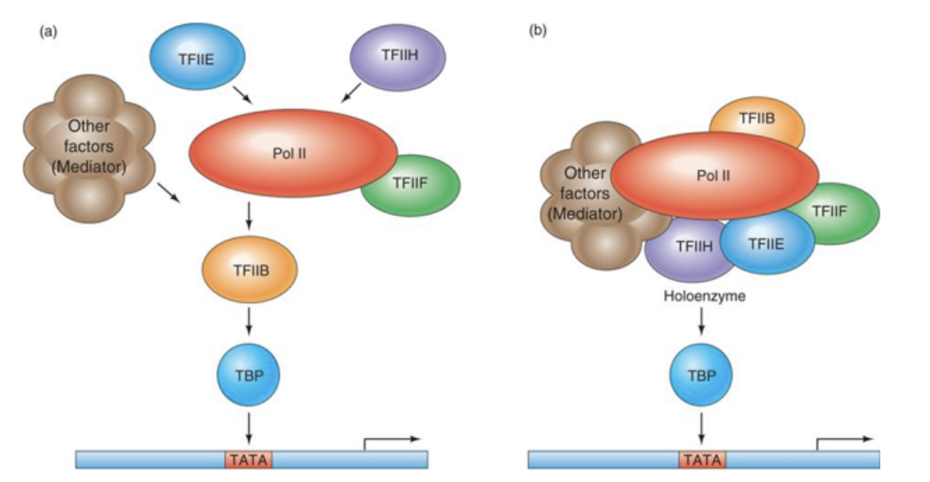 위 그림에 그 두 가지 가설이 나타나 있음. 우선 (a)의 경우 activator가 stepwise로 하나하나 transcription factor들을 build-up하고, 그 결과 complex가 생성된다는 가설임. 다음으로 (b)의 경우 activator가 (우선 TBP를 TATA box에 recruit한 다음) 이미 assemble되어있는 holoenzyme을 TBP로 recruit시킨다는 가설임. 결과적으로 이 가설들은 둘 다 어느정도 맞다는 결론이 내려짐. 지금부터 이와 관련된 실험 결과들에 대해 살펴보자.