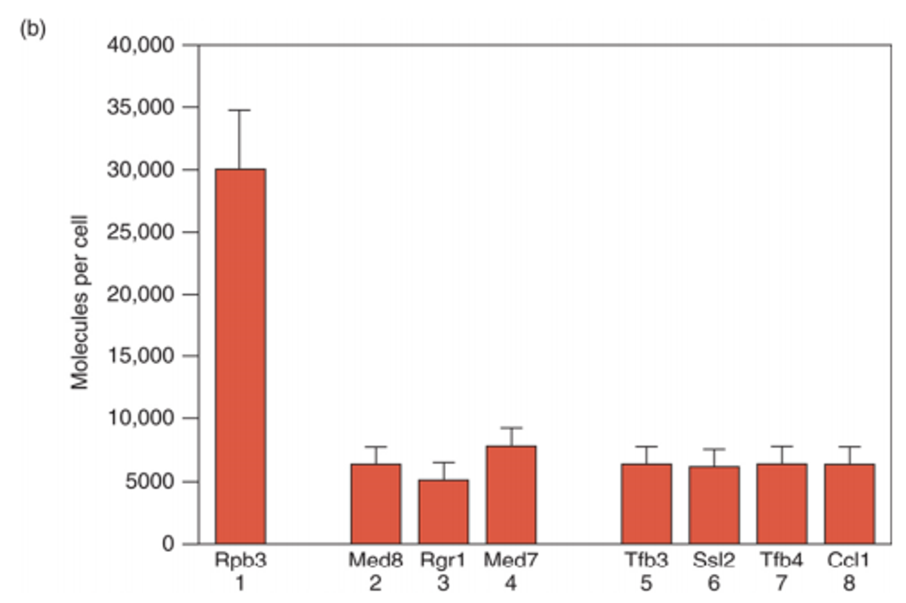 만약 모든 activator가 다 holoenzyme 전체를 불러온다면 holoenzyme을 이루고 있는 RNA polymerase subunit, general transcription factor, mediator 등의 개수비는 일정해야 할 것임. (물론 이 때 개수비는 결합비율을 고려한 개수비임) 이 개수비가 정말 일정한지를 확인하기 위해 아래와 같은 실험을 수행함.