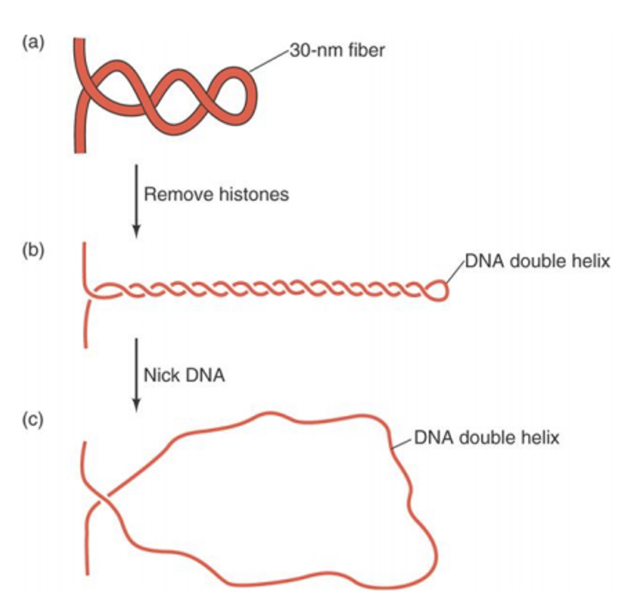 하나하나 살펴보자. 우선 30nm fiber가 형성되어 있는 chromatin에서 histone을 제거해줌. 그랬더니 (b)와 같은 supercoil이 형성됨. (진핵생물에서 supercoil이 형성되었다는 말은 DNA의 양 끝이 (b)그림 왼쪽과 같이 어딘가에 고정되어 있다는 뜻임) 이후 DNA에 nick을 만들어주게 되면 supercoil이 형성되어 있던 부분이 풀리면서 (c)와 같은 거대한 고리를 만들게 됨.