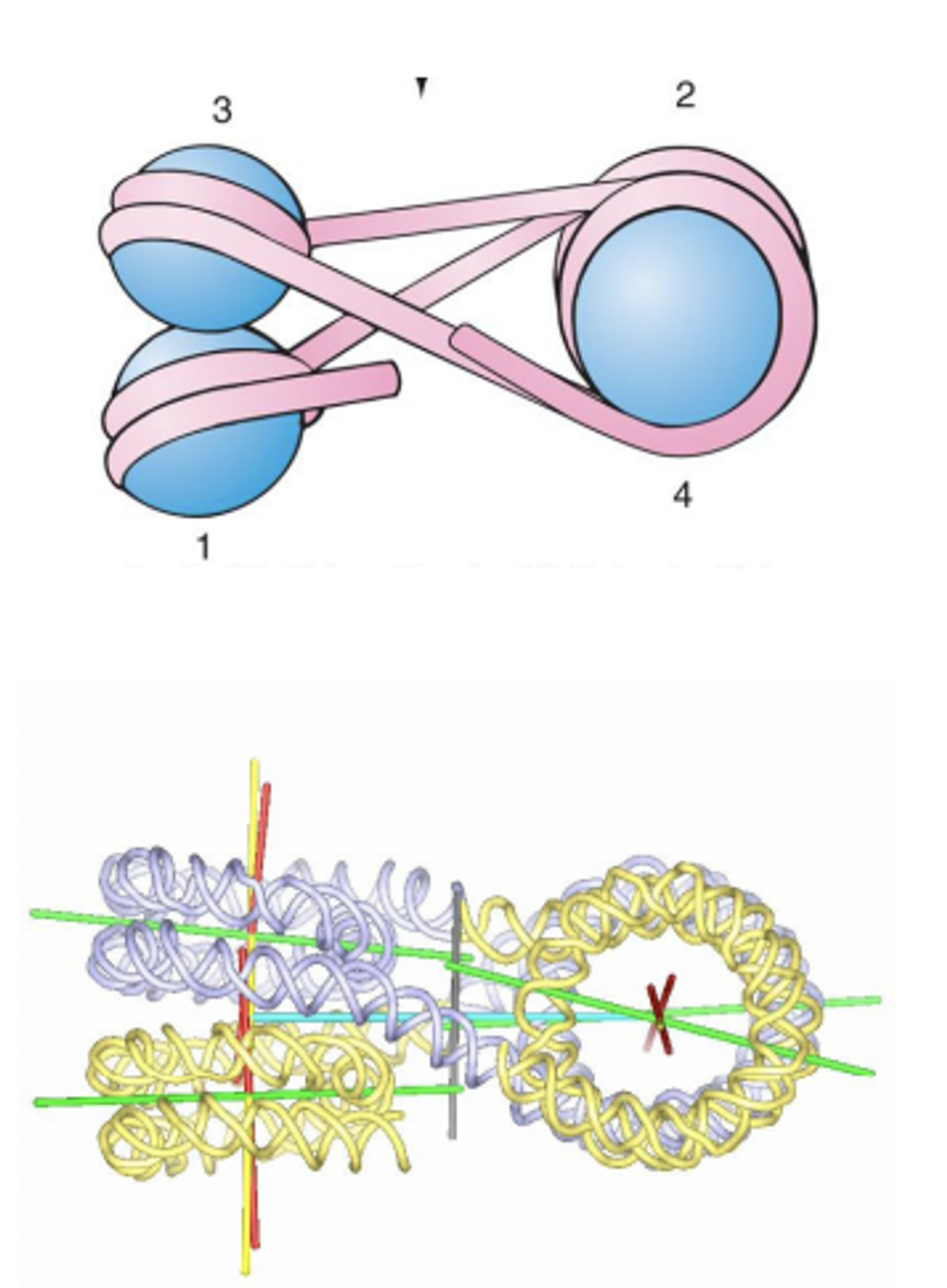 위 그림에 나타나 있는 것과 같은 4개의 nucleosome으로 이루어진 구조를 x-ray crystallography로 관찰해봄. (물론 이 때 사용한 x-ray crystallography의 resolution은 9옹스트롬정도로, 보통 한 2~3옹스트롬 정도의 resolution을 가지고 있어야 atom의 정확한 position을 특정할 수 있다고는 함. 그러나 9옹스트롬 정도의 resolution만으로도 어느 정도 정확한 position 확인이 가능함)