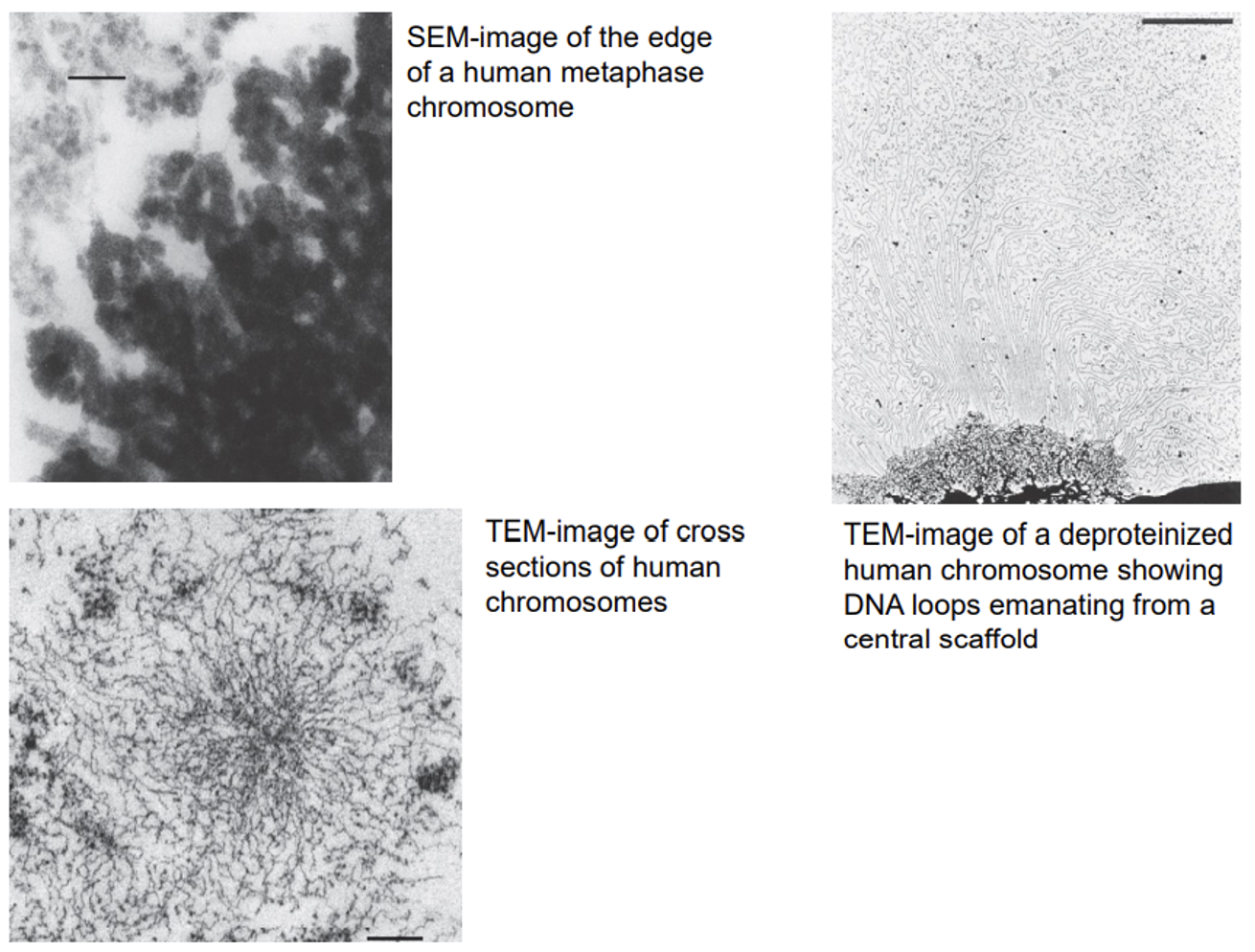 위 그림은 전자현미경을 이용해서 실제로 chromosome이 형성될 때의 구조를 관찰한 것임. 보면 가운데의 scaffold를 중심으로 해서 가쪽으로 loop 형태의 30nm fiber가 튀어나와있음을 확인 가능함. (참고로 위 그림 왼쪽 위가 human metaphase에서의 SEM image, 왼쪽 아래가 TEM image, 오른쪽 위가 histone을 제거한 후 찍은 TEM image임)