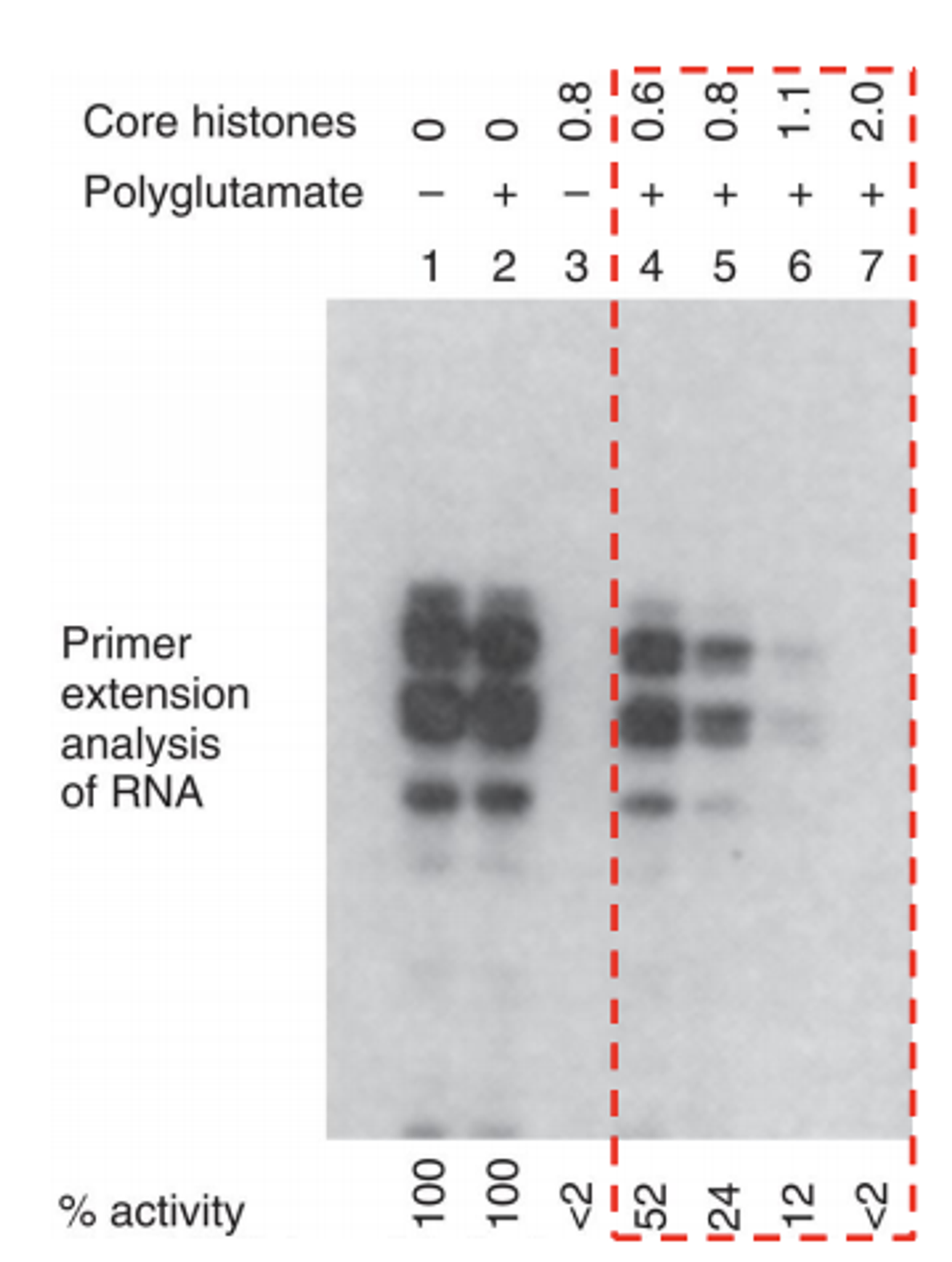 위 그림은 octamer로 이루어진 core histone들이 실제로 전사에 어떤 영향을 미치는지에 대해 알아보기 위해 수행한 primer extension analysis of RNA(전사 정도를 알아볼 수 있는 실험 기법)의 결과임.