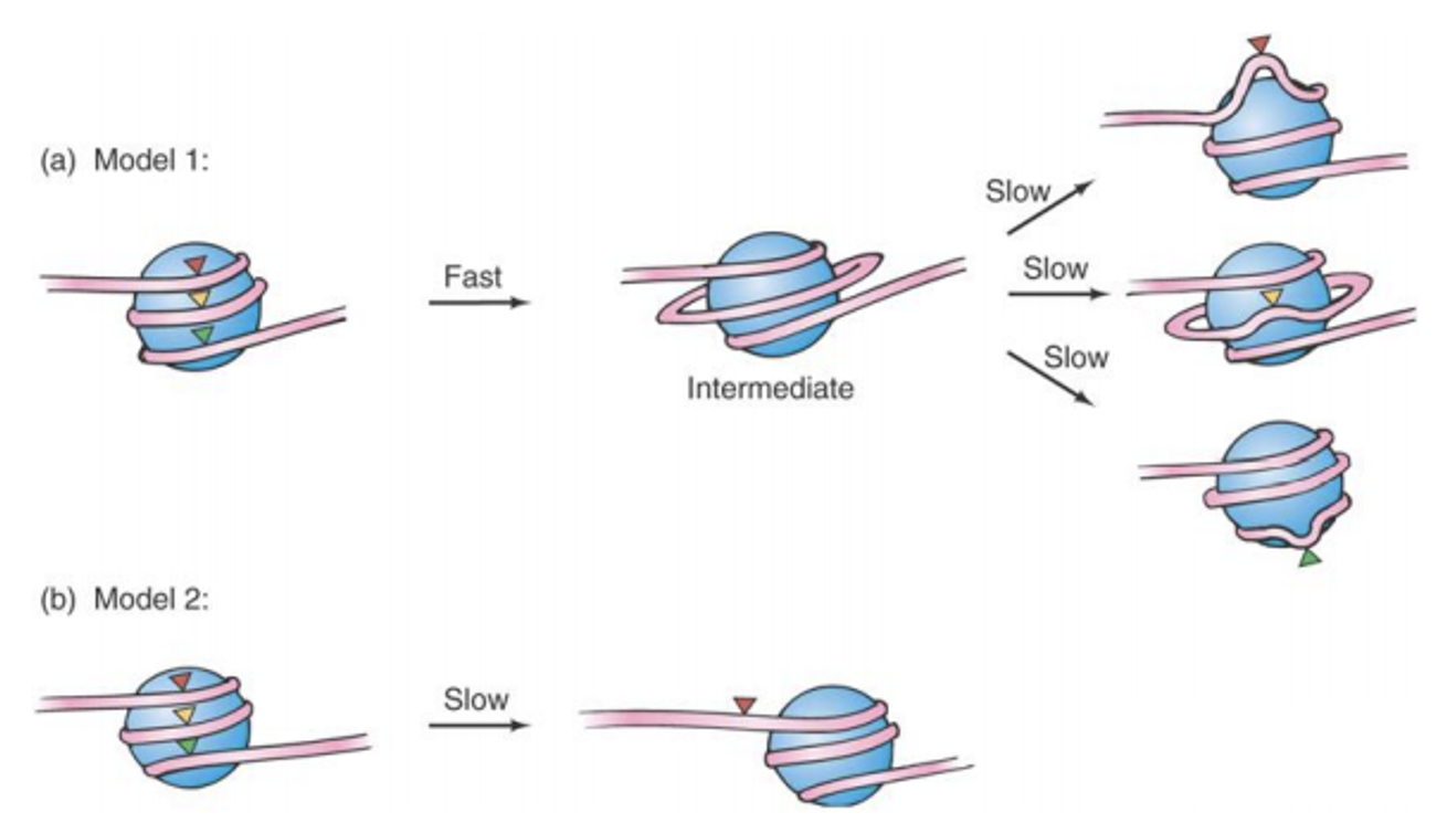 model 2는 nucleosome이 DNA line을 따라 sliding하고(nucleosome이 옆으로 이동하고), 그 결과 위 그림의 붉은 위치와 같은 gene들이 naked되어서 결과적으로 이 gene들의 전사 활성화가 일어날 수 있다는 내용임.