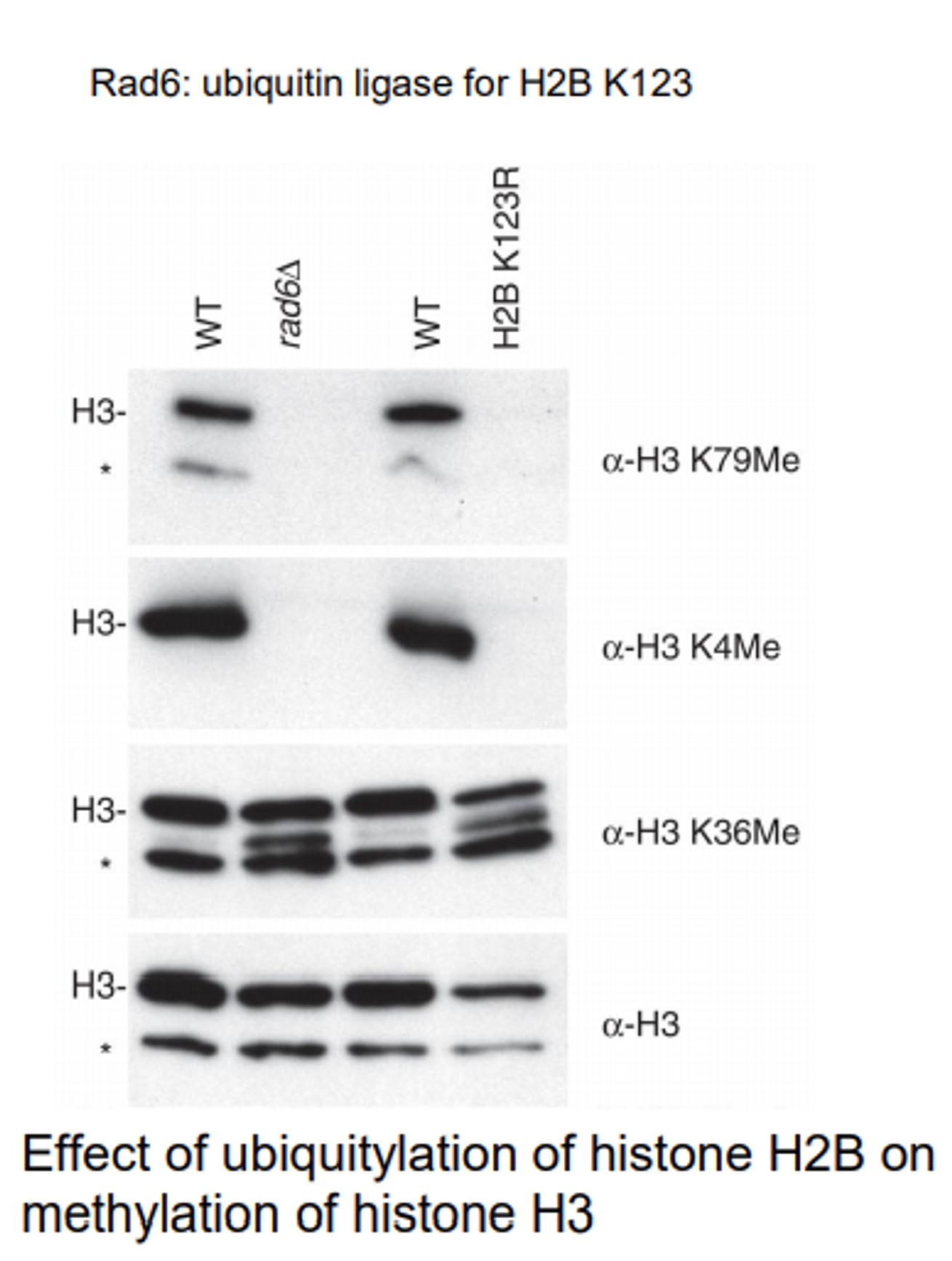 이 경우 특히 Rad6라는 단백질이 정상인 sample과 Rad6라는 단백질이 mutated된 sample에 대해 ChIP assay를 수행함. (앞서와 마찬가지로 다양한 modification을 인지할 수 있는 antibody를 사용함) 이 때 Rad6는 H2B K123 자리에 ubiquitin을 붙여주는 역할을 하는 녀석이므로, Rad6에 mutation이 일어난 경우 H2B K123에 ubiquitin이 붙지 못할 것임. (혹은 아예 H2B K123 자리 자체를 없애도[H2B K123R] mutated Rad6를 썻을 때와 거의 identical한 효과가 나타날 것임)