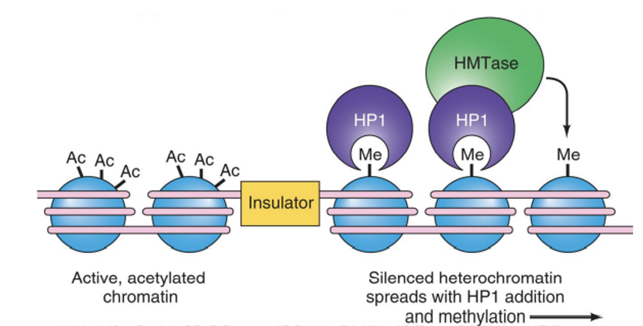 H3의 N-terminal tail에 위치하는 lysine 9에 methylation이 일어나게 되면, 이 부분은 HP1이라는 단백질을 recruit하게 되고, HP1은 histone methyltransferase(HMTase)를 recruit하게 됨. HMTase는 위 그림에 나타나 있는 것처럼 주변 histone들에도 순차적으로 추가적인 methylation을 시켜주게 되고, 결과적으로 전반적인 repression이 유발됨.