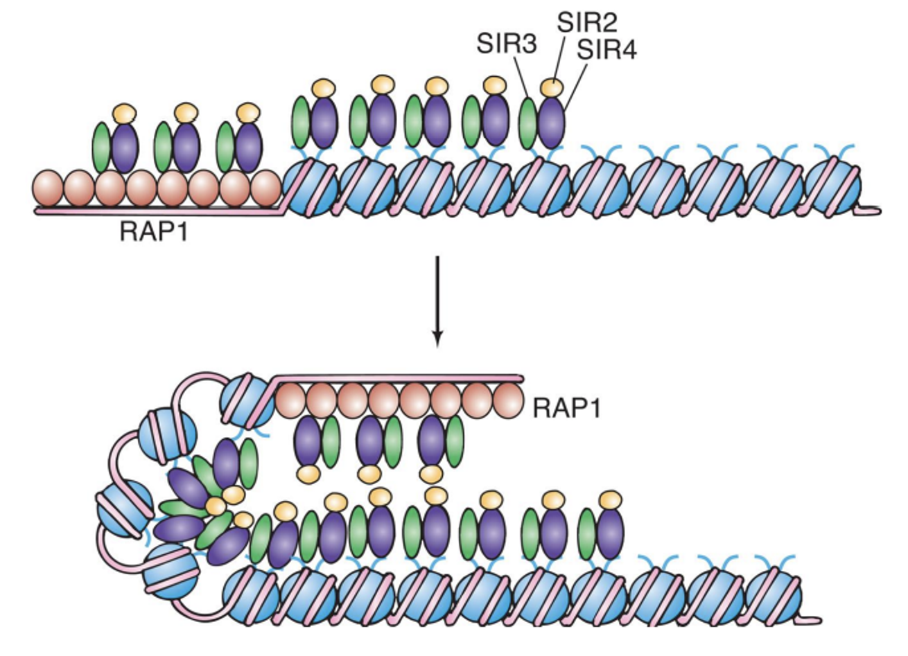 TPE를 유발시키는 것은 RAP1, SIR(silencing information regulator)3, SIR4, SIR2와 같은 단백질들이며, 이 녀석들이 heterochromatin을 만들고 gene repression이 계속 유지되게 하는 역할을 수행함.