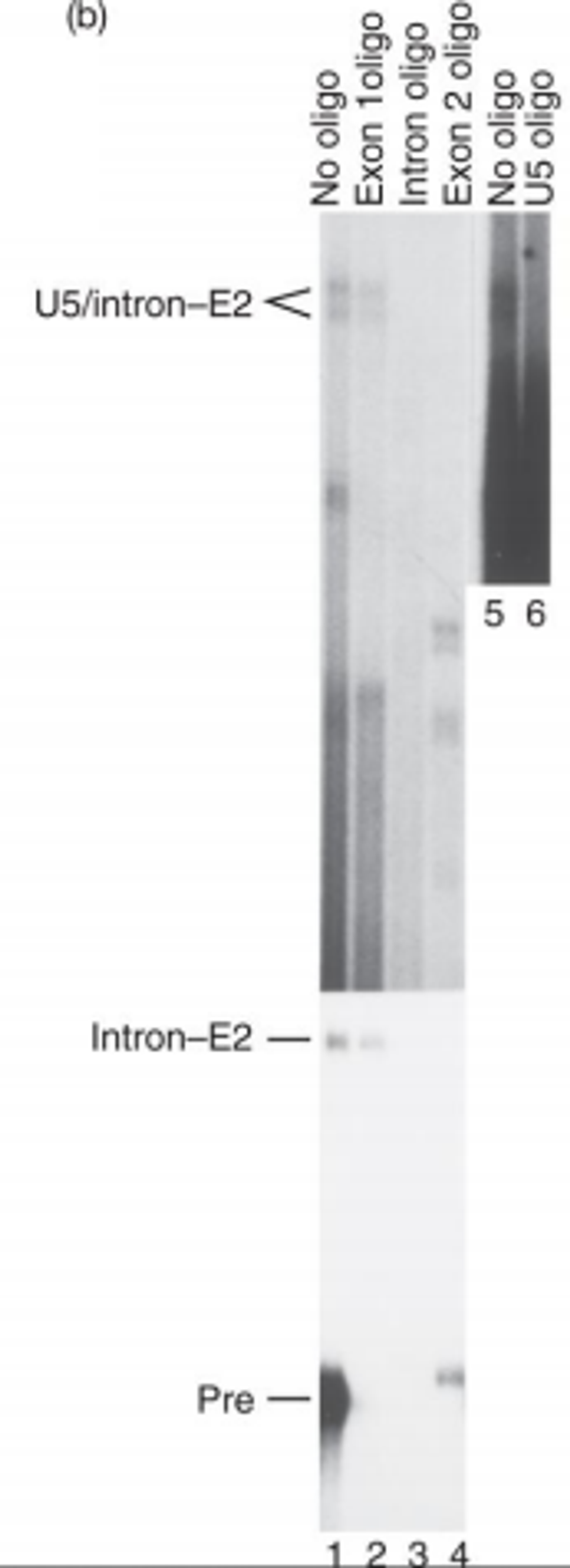 실험 결과를 보면 complex에 exon 1 oligo를 넣어줬을 경우 band가 거의 그대로 관찰된 반면, intron oligo, exon 2 oligo를 넣었을 때는 band가 사라짐. 이를 통해 complex에 exon 2와 intron이 포함되어 있음을 알 수 있음. 이와 함께 lane 5, 6을 비교해보면 아무 oligo를 넣지 않았을 때(5)에 비해 U5 oligo를 넣었을 때(6) complex에 해당하는 위치에서의 band가 연해짐을 관측 가능함.