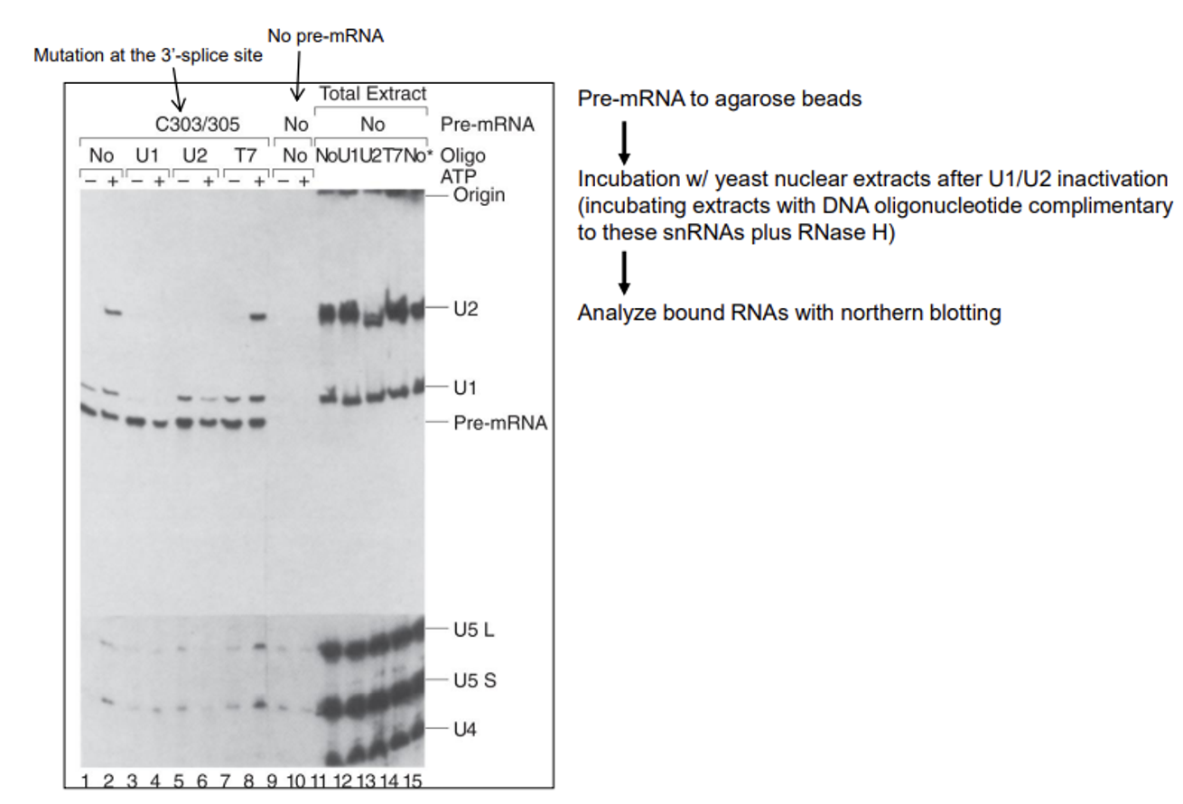 이 경우 pre-mRNA를 붙인 agarose bead에 nuclear extract를 통과시킴. 이 때 bead 표면에 있는 pre-mRNA에 어떤 녀석들이 붙어서 splicing을 시키는지를 nothern blot으로 시간대별로 분석한 결과가 위 그림 왼쪽에 나타나 있음.