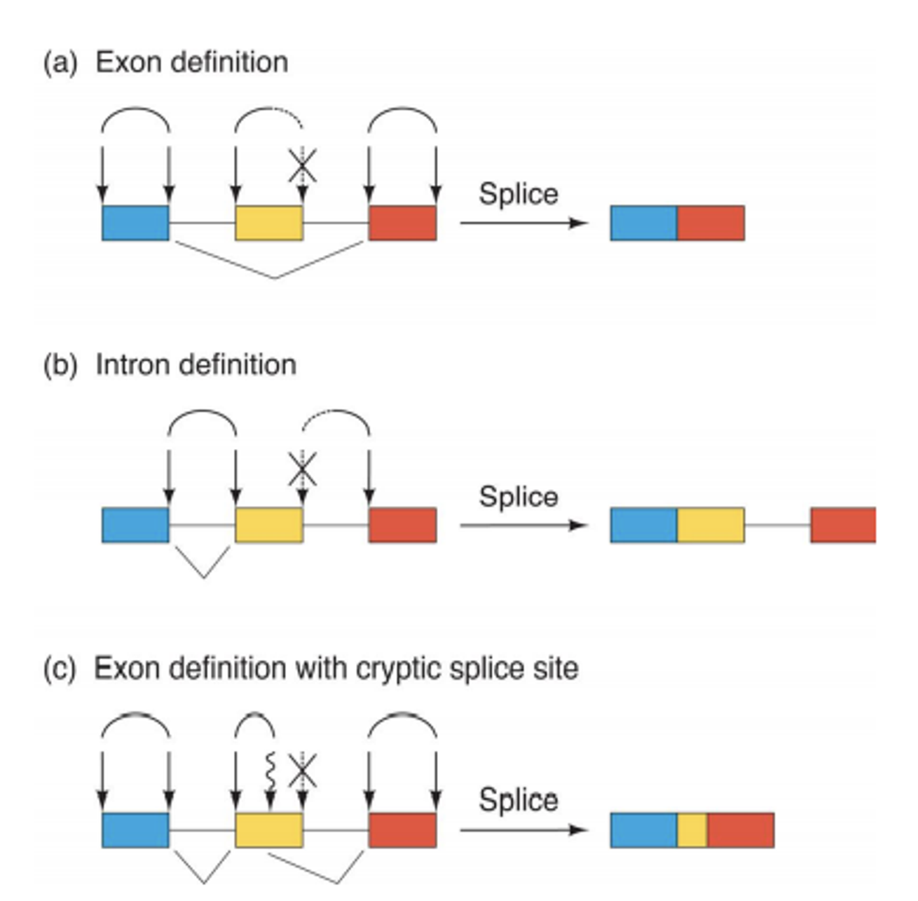 하나하나 살펴보자. exon definition의 경우 쉽게 말하면 exon을 인지해서 intron을 잘라내는 mechanism을 의미함. 그렇기에 위 그림 (a)와 같이 특정 exon-intron boundary site를 변형시키게 되면 그 결과 노란색 부위도 intron으로 인지되어 제거됨.