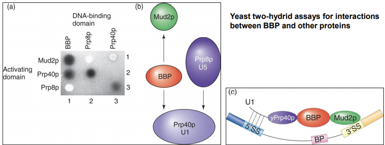 위 그림 왼쪽 (a)를 보면 Prp40p, Mud2p, Prp8p, BBP 간의 상호결합여부를 판단하기 위해 수행한 yeast two-hybrid assay의 결과가 나타나 있음. 이를 통해 (b)와 같이 단백질들이 어떤 식으로 상호작용하는지를 알 수 있고, 결과적으로 이들 단백질들이 연결되어 (c)와 같은 bridge를 형성한다는 것을 알 수 있음. 이 bridge에 의해 intron이 define되고, 그 결과 define된 intron 부분이 제거될 수 있음.